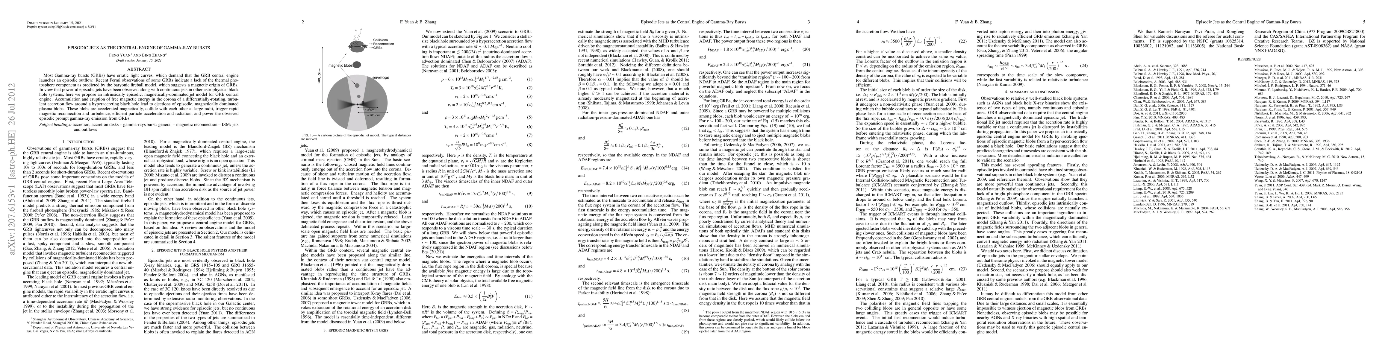 This paper proposes a magnetically-dominated, episodic jet model for the central engine of Gamma-ray bursts (GRBs), suggesting that magnetic energy accumulation in a turbulent accretion flow around a hyperaccreting black hole leads to the ejection of episodic plasma blobs, which collide and accelerate to produce the observed GRB emissions.