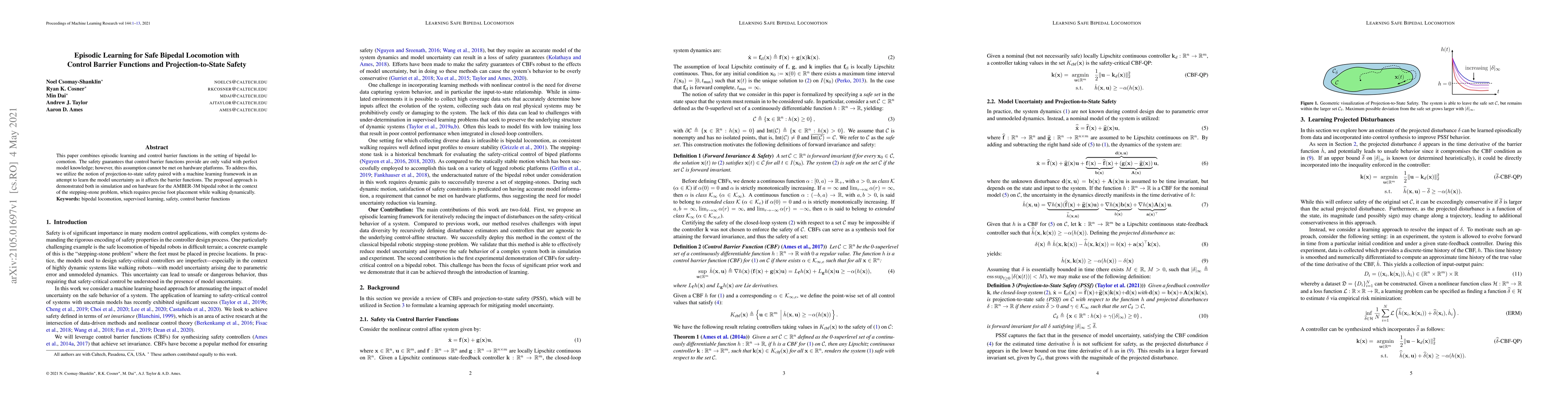 This paper combines episodic learning and control barrier functions in the setting of bipedal locomotion. The safety guarantees that control barrier functions provide are only valid with perfect model knowledge; however, this assumption cannot be met on hardware platforms. To address this, we utilize the notion of projection-to-state safety paired with a machine learning framework in an attempt to learn the model uncertainty as it affects the barrier functions. The proposed approach is demonstrated both in simulation and on hardware for the AMBER-3M bipedal robot in the context of the stepping-stone problem, which requires precise foot placement while walking dynamically.