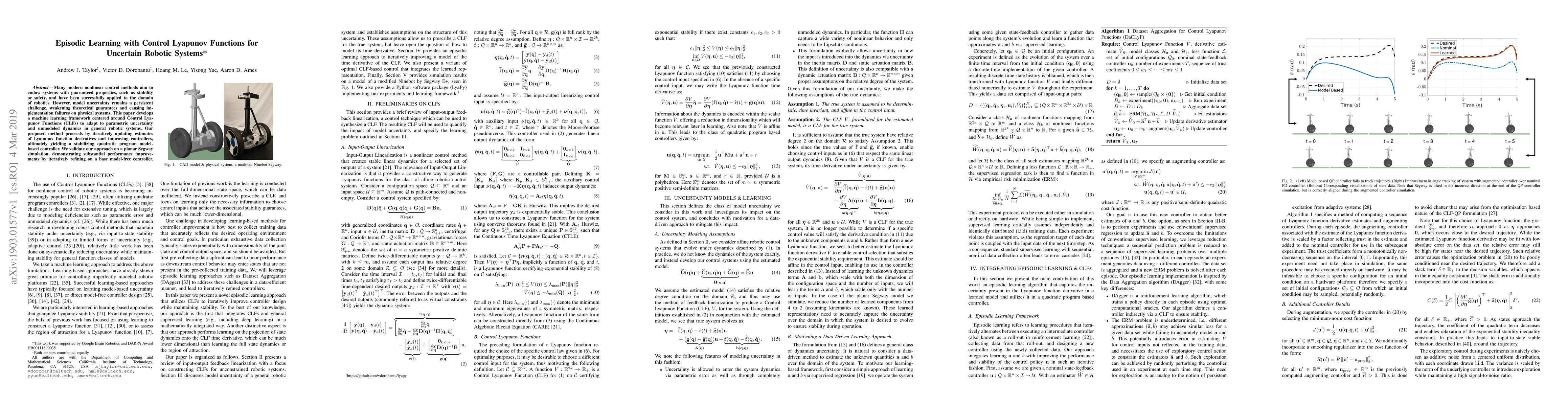 This paper proposes a machine learning framework using Control Lyapunov Functions to adapt to model uncertainty in robotic systems, iteratively refining Lyapunov function derivatives and controllers to achieve a stabilizing quadratic program model-based controller. The method is validated on a planar Segway simulation, showing significant performance enhancements over a base model-free controller.