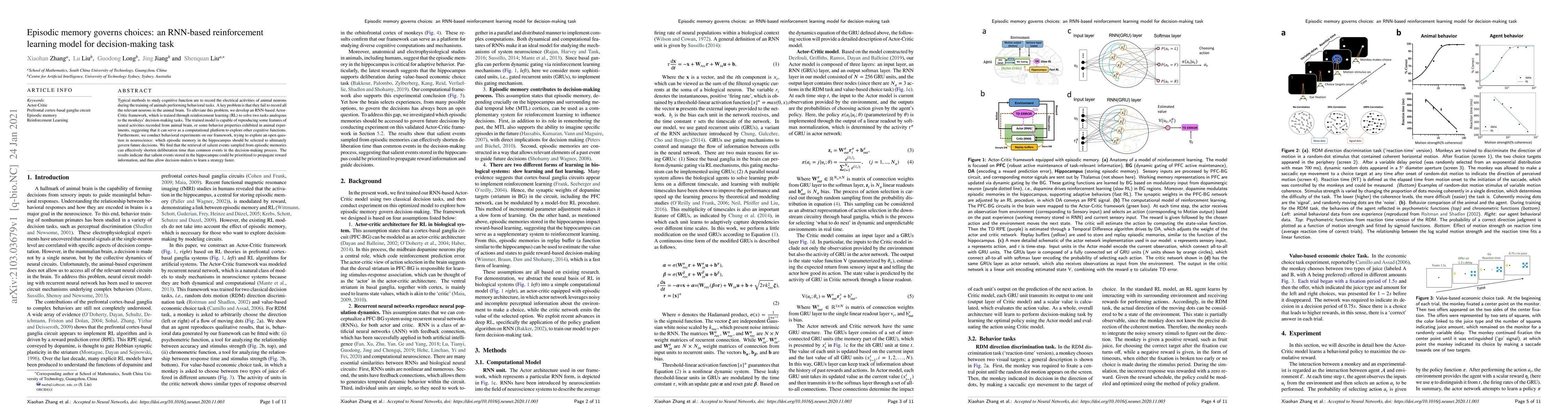 Typical methods to study cognitive function are to record the electrical activities of animal neurons during the training of animals performing behavioral tasks. A key problem is that they fail to record all the relevant neurons in the animal brain. To alleviate this problem, we develop an RNN-based Actor-Critic framework, which is trained through reinforcement learning (RL) to solve two tasks analogous to the monkeys' decision-making tasks. The trained model is capable of reproducing some features of neural activities recorded from animal brain, or some behavior properties exhibited in animal experiments, suggesting that it can serve as a computational platform to explore other cognitive functions. Furthermore, we conduct behavioral experiments on our framework, trying to explore an open question in neuroscience: which episodic memory in the hippocampus should be selected to ultimately govern future decisions. We find that the retrieval of salient events sampled from episodic memories can effectively shorten deliberation time than common events in the decision-making process. The results indicate that salient events stored in the hippocampus could be prioritized to propagate reward information, and thus allow decision-makers to learn a strategy faster.