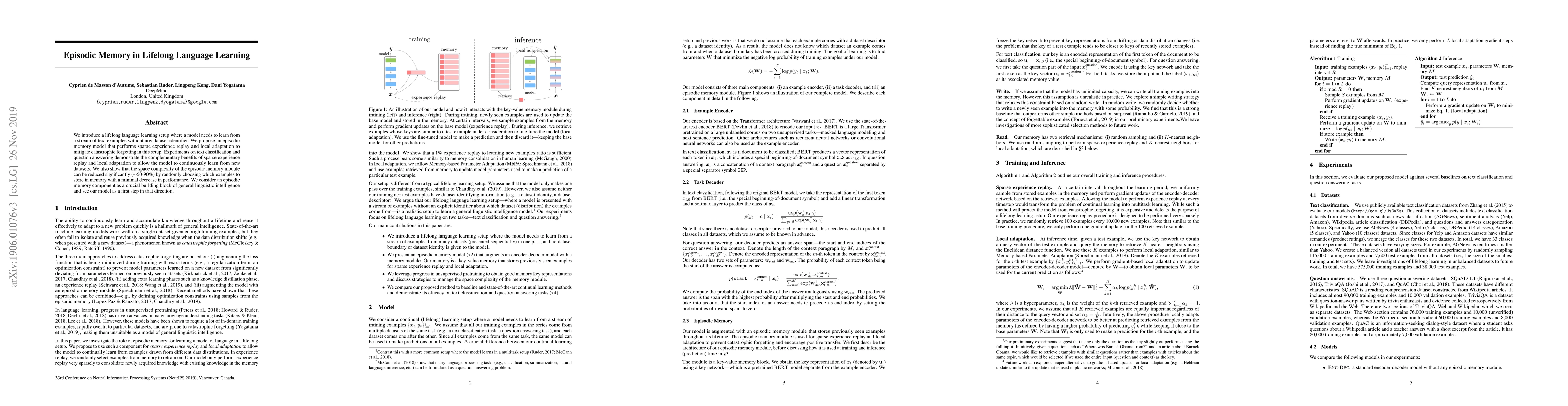 This paper proposes an episodic memory model for lifelong language learning, utilizing sparse experience replay and local adaptation to prevent catastrophic forgetting. The model demonstrates improved performance on text classification and question answering while significantly reducing memory usage.
