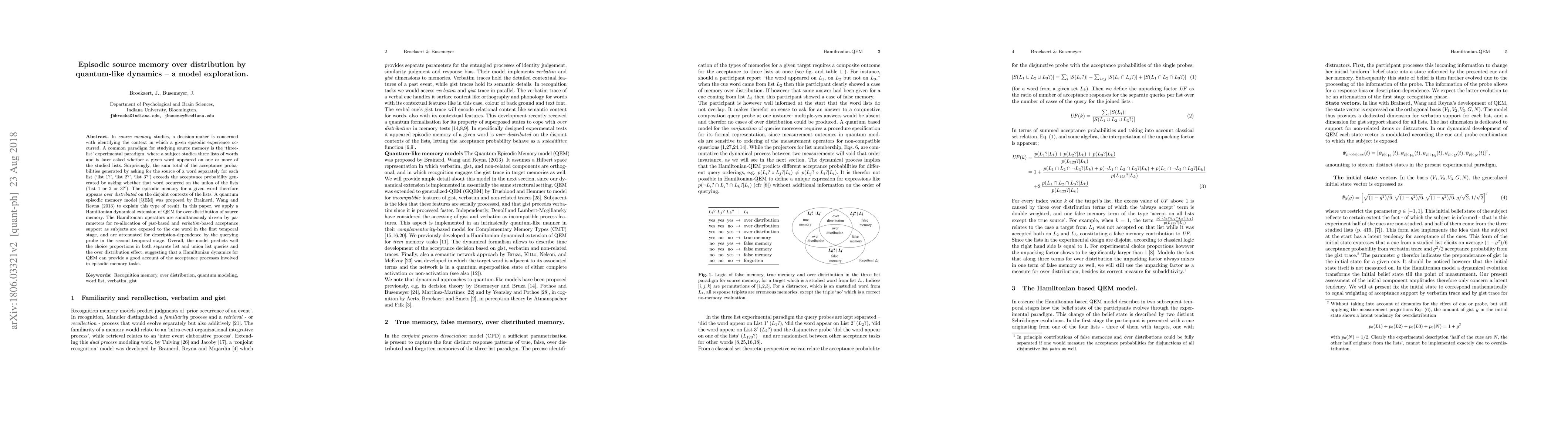 The research applies a Hamiltonian dynamical extension of the Quantum Episodic Memory Model (QEM) to explain the over distribution effect in source memory tasks. It uses a Hamiltonian-QEM model with a state vector evolving through two temporal stages: cue presentation and probe presentation. The model incorporates four types of transports embedded in the Hamiltonians, with parameters regulating gist-based and verbatim-based acceptance support.