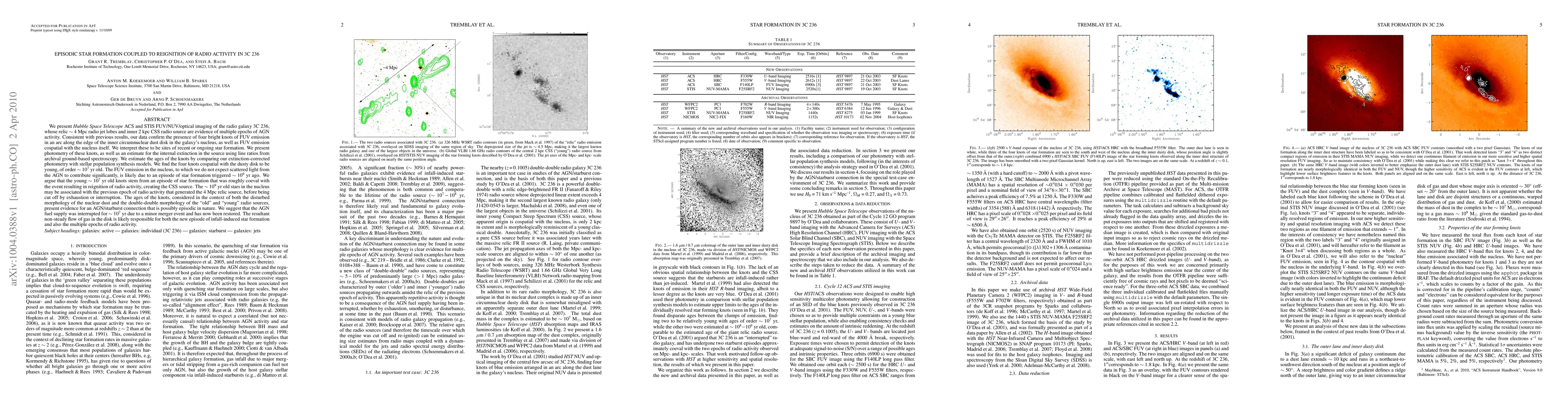 We present Hubble Space Telescope UV and optical imaging of the radio galaxy 3C 236, whose relic 4 Mpc radio jet lobes and inner 2 kpc CSS radio source are evidence of multiple epochs of AGN activity. Our data confirm the presence of four bright knots of FUV emission in an arc along the edge of the inner circumnuclear dust disk in the galaxy's nucleus, as well as FUV emission cospatial with the nucleus itself. We interpret these to be sites of recent or ongoing star formation. We present photometry of these knots, as well as an estimate for the internal extinction in the source using the Balmer decrement from SDSS spectroscopy. We estimate the ages of the knots by comparing our extinction-corrected photometry with stellar population synthesis models. We find the four knots cospatial with the dusty disk to be young, of order 10^7 yr old. The FUV emission in the nucleus is likely due to an episode of star formation triggered ~10^9 yr ago. We argue that the young 10^7 yr old knots stem from an episode of star formation that was roughly coeval with the event resulting in reignition of radio activity, creating the CSS source. The 10^9 yr old stars in the nucleus may be associated with the previous epoch of activity that generated the 4 Mpc relic source, before it was cut off by exhaustion or interruption. The ages of the knots, considered in context with the disturbed morphology of the nuclear dust and the double-double morphology of the "old" and "young" radio sources, present evidence for an episodic AGN/starburst connection. We suggest that the AGN fuel supply was interrupted for ~10^7 yr due to a minor merger event and has now been restored, and the resultant non-steady flow of gas toward the nucleus is likely responsible for both the new episode of infall-induced star formation and also the multiple epochs of radio activity.