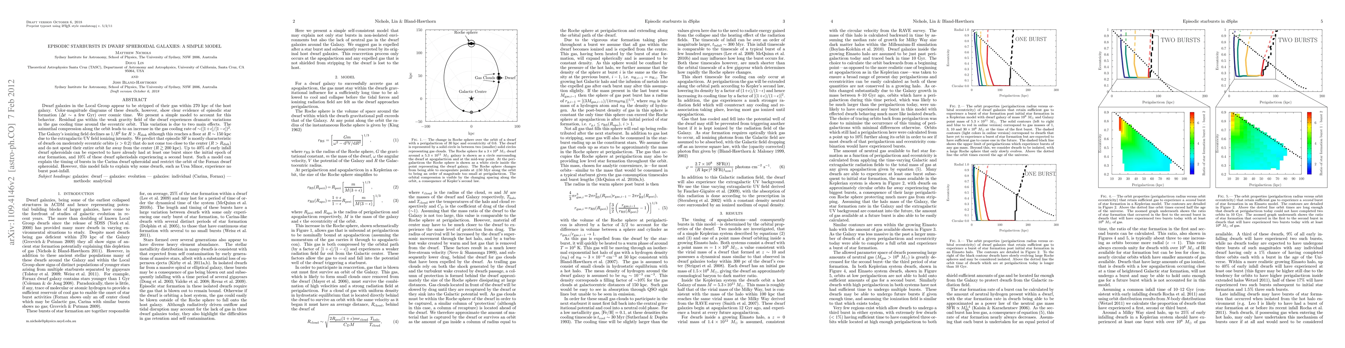 Dwarf galaxies in the Local Group appear to be stripped of their gas within 270 kpc of the host galaxy. Color-magnitude diagrams of these dwarfs, however, show clear evidence of episodic star formation (\Delta{}t ~ a few Gyr) over cosmic time. We present a simple model to account for this behaviour. Residual gas within the weak gravity field of the dwarf experiences dramatic variations in the gas cooling time around the eccentric orbit. This variation is due to two main effects. The azimuthal compression along the orbit leads to an increase in the gas cooling rate of ~([1+\epsilon]/[1-\epsilon])^2. The Galaxy's ionizing field declines as 1/R^2 for R>R_disk although this reaches a floor at R~150 kpc due to the extragalactic UV field ionizing intensity. We predict that episodic SF is mostly characteristic of dwarfs on moderately eccentric orbits (\epsilon>0.2) that do not come too close to the centre (R>R_disk) and do not spend their entire orbit far away from the centre (R>200 kpc). Up to 40% of early infall dwarf spheroidals can be expected to have already had at least one burst since the initial epoch of star formation, and 10% of these dwarf spheriodals experiencing a second burst. Such a model can explain the timing of bursts in the Carina dwarf spheroidal and restrict the orbit of the Fornax dwarf spheroidal. However, this model fails to explain why some dwarfs, such as Ursa Minor, experience no burst post-infall.