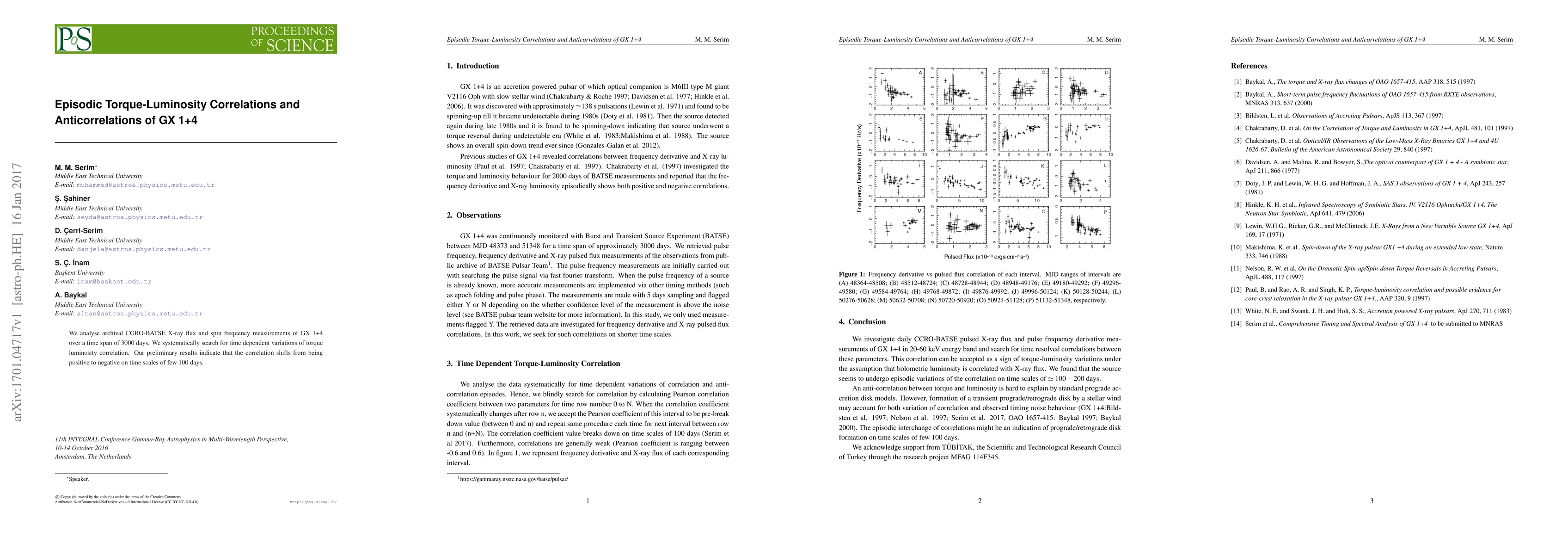 This study investigates episodic torque-luminosity correlations in the X-ray source GX 1+4 using CGRO-BATSE data over 3000 days, revealing a shift from positive to negative correlation on timescales of a few hundred days.