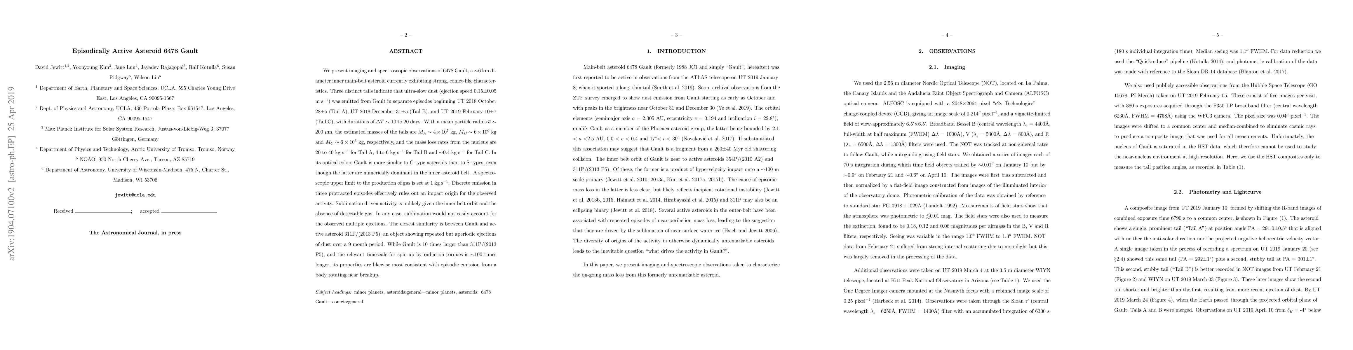 This study reveals that asteroid 6478 Gault exhibits comet-like activity, characterized by three distinct dust tails emitted in separate episodes, suggesting episodic dust ejections rather than continuous sublimation or impact. The observed activity aligns with repeated, aperiodic dust ejections similar to active asteroid 311P/(2013 P5).