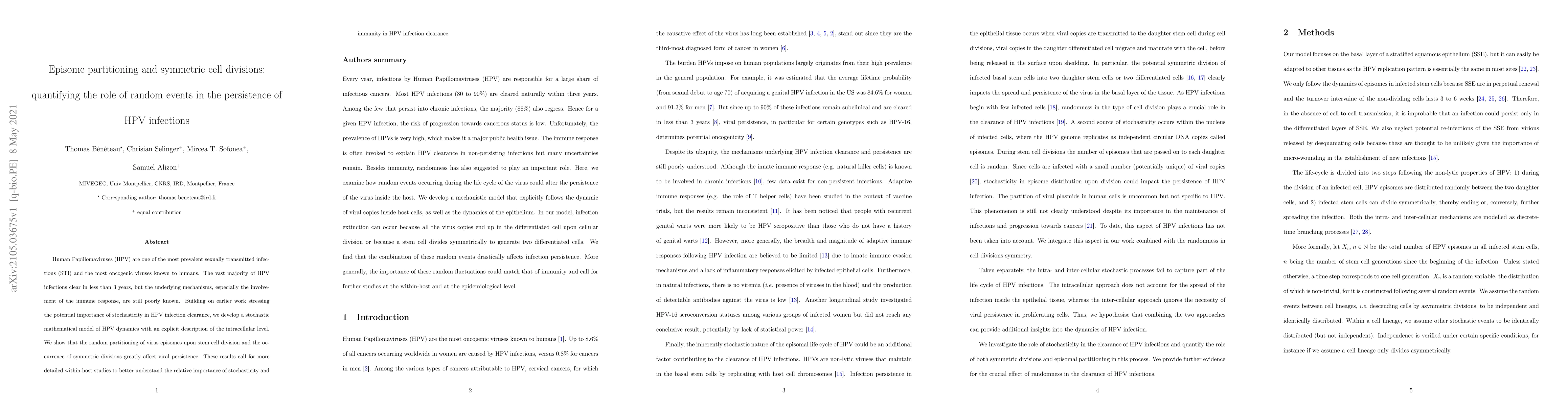 This paper develops a stochastic mathematical model to explore the role of random events, such as episome partitioning and symmetric cell divisions, in the persistence of HPV infections. The study finds that these random processes significantly impact viral persistence, highlighting the need for further research to understand the interplay between stochasticity and immune response in HPV infection clearance.