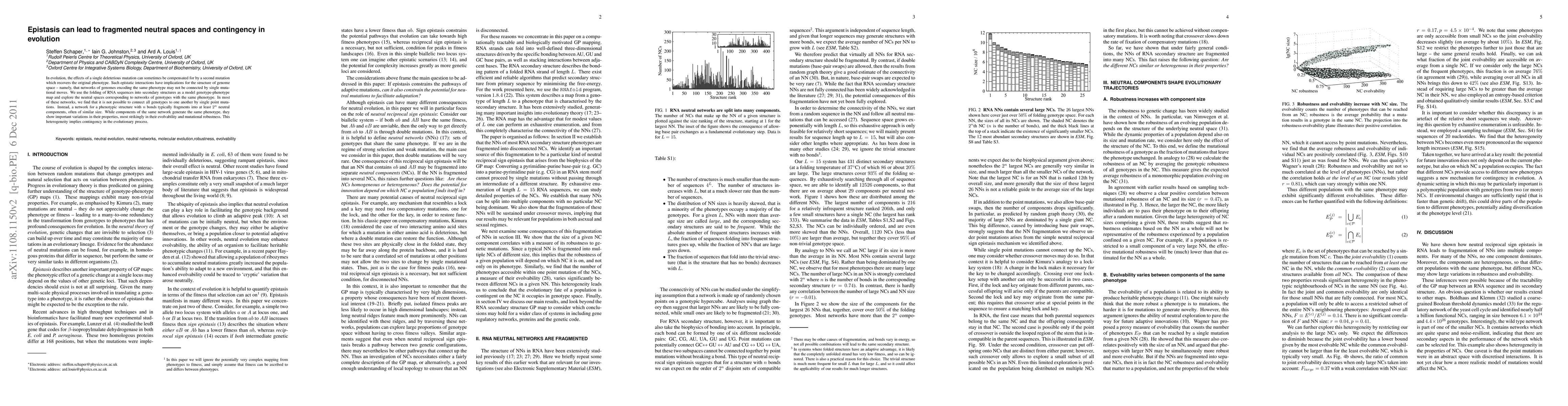 In evolution, the effects of a single deleterious mutation can sometimes be compensated for by a second mutation which recovers the original phenotype. Such epistatic interactions have implications for the structure of genome space - namely, that networks of genomes encoding the same phenotype may not be connected by single mutational moves. We use the folding of RNA sequences into secondary structures as a model genotype-phenotype map and explore the neutral spaces corresponding to networks of genotypes with the same phenotype. In most of these networks, we find that it is not possible to connect all genotypes to one another by single point mutations. Instead, a network for a phenotypic structure with $n$ bonds typically fragments into at least $2^n$ neutral components, often of similar size. While components of the same network generate the same phenotype, they show important variations in their properties, most strikingly in their evolvability and mutational robustness. This heterogeneity implies contingency in the evolutionary process.