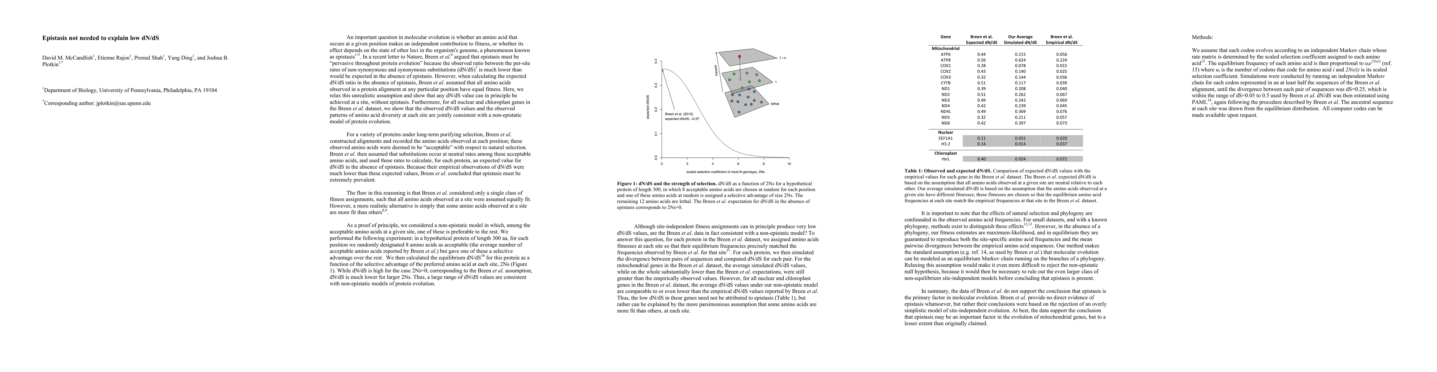 This paper challenges the notion that epistasis, or the dependency of an amino acid's fitness contribution on other genomic loci, is necessary to explain low dN/dS ratios in molecular evolution. By relaxing the assumption of equal fitness for all amino acids at a position, the authors show that any dN/dS value can be achieved without epistasis. They also demonstrate that observed dN/dS values and amino acid diversity patterns in the Breen et al. dataset are consistent with a non-epistatic model.