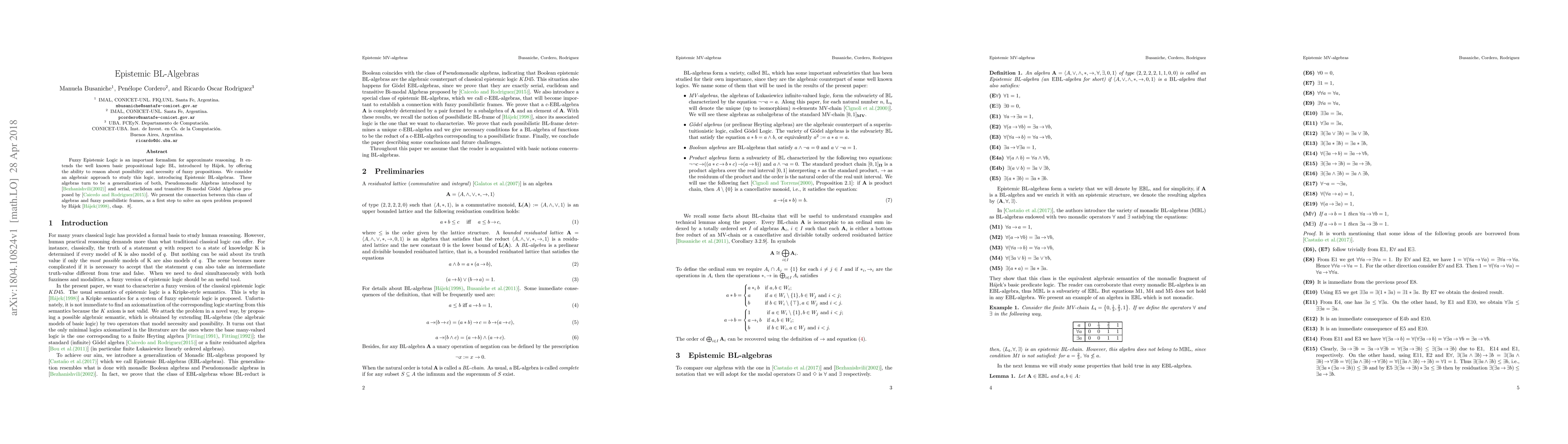 Fuzzy Epistemic Logic is an important formalism for approximate reasoning. It extends the well known basic propositional logic BL, introduced by H\'ajek, by offering the ability to reason about possibility and necessity of fuzzy propositions. We consider an algebraic approach to study this logic, introducing Epistemic BL-algebras. These algebras turn to be a generalization of both, Pseudomonadic Algebras introduced by \cite{Bez2002} and serial, euclidean and transitive Bi-modal G\"odel Algebras proposed by \cite{CaiRod2015}. We present the connection between this class of algebras and fuzzy possibilistic frames, as a first step to solve an open problem proposed by H\'ajek \cite[chap. ~8]{HajekBook98}.