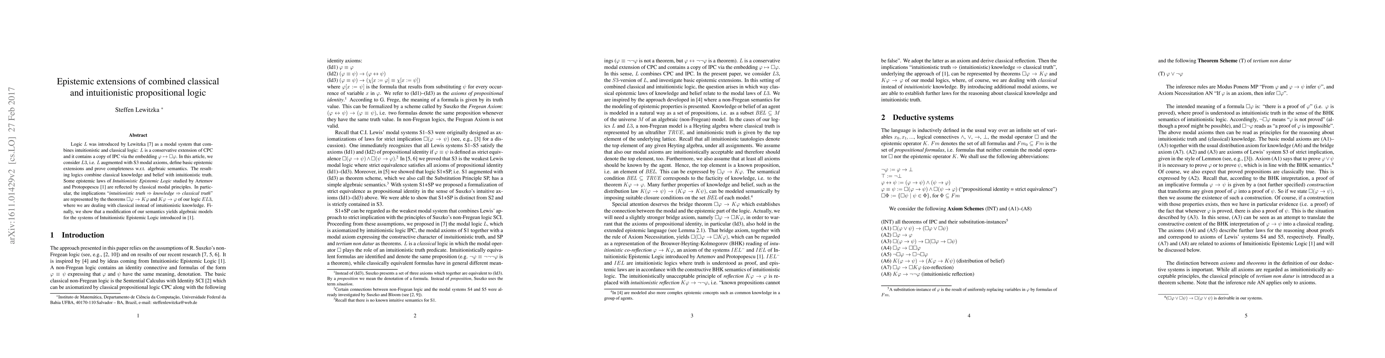 Logic $L$ was introduced by Lewitzka [7] as a modal system that combines intuitionistic and classical logic: $L$ is a conservative extension of CPC and it contains a copy of IPC via the embedding $\varphi\mapsto\square\varphi$. In this article, we consider $L3$, i.e. $L$ augmented with S3 modal axioms, define basic epistemic extensions and prove completeness w.r.t. algebraic semantics. The resulting logics combine classical knowledge and belief with intuitionistic truth. Some epistemic laws of Intuitionistic Epistemic Logic studied by Artemov and Protopopescu [1] are reflected by classical modal principles. In particular, the implications "intuitionistic truth $\Rightarrow$ knowledge $\Rightarrow$ classical truth" are represented by the theorems $\square\varphi\rightarrow K\varphi$ and $K\varphi\rightarrow\varphi$ of our logic $EL3$, where we are dealing with classical instead of intuitionistic knowledge. Finally, we show that a modification of our semantics yields algebraic models for the systems of Intuitionistic Epistemic Logic introduced in [1].