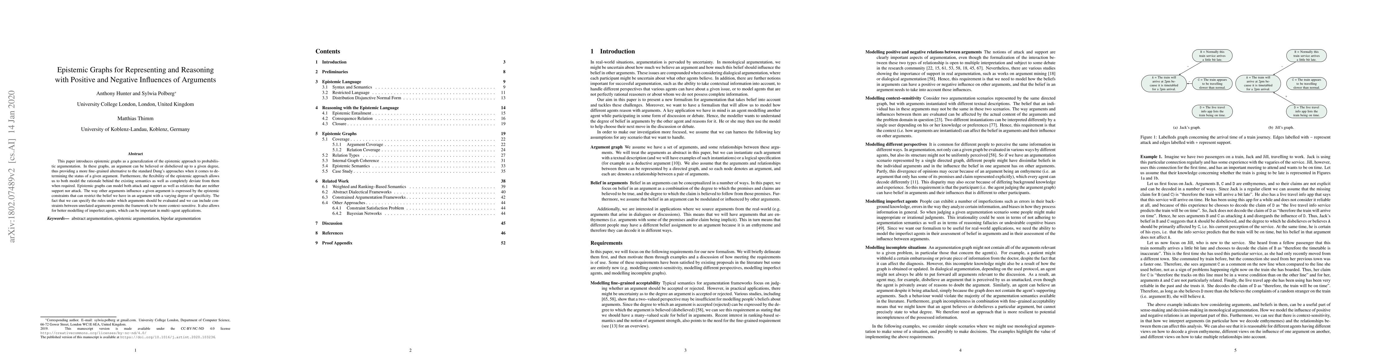 This paper introduces epistemic graphs to represent and reason with arguments that have positive and negative influences, providing a more fine-grained alternative to existing approaches. It offers context-sensitive modeling of imperfect agents and allows for better evaluation of arguments with varying degrees of specificity.