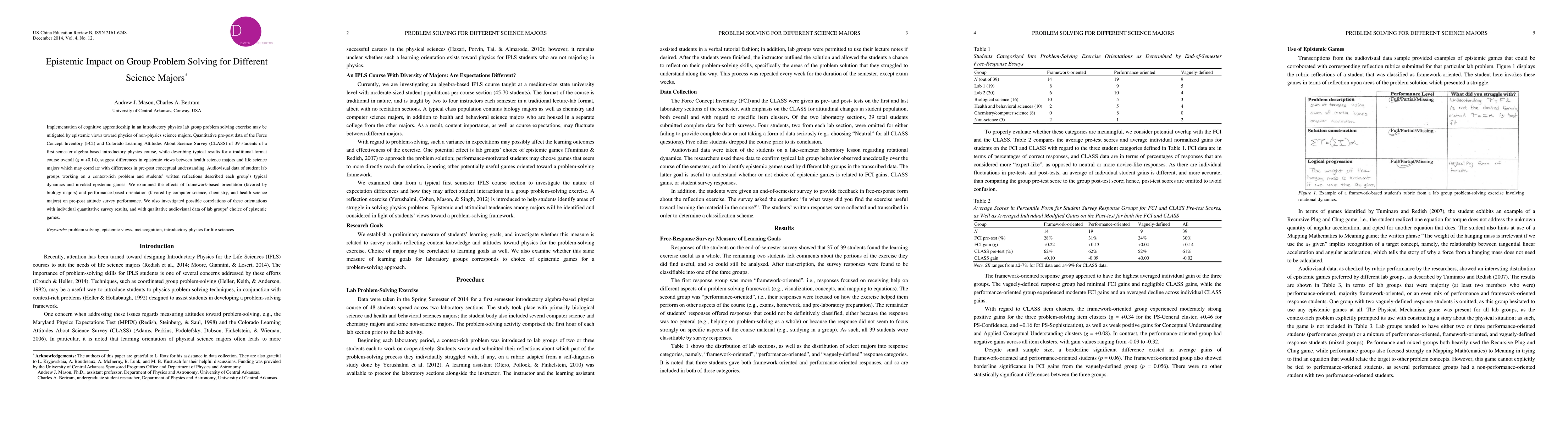 This study investigates how cognitive apprenticeship in a physics lab affects group problem-solving among different science majors, finding that non-physics majors' epistemic views correlate with differing conceptual understanding gains and group dynamics. The research highlights the impact of framework-based versus performance-based orientations on students' attitudes and conceptual learning.