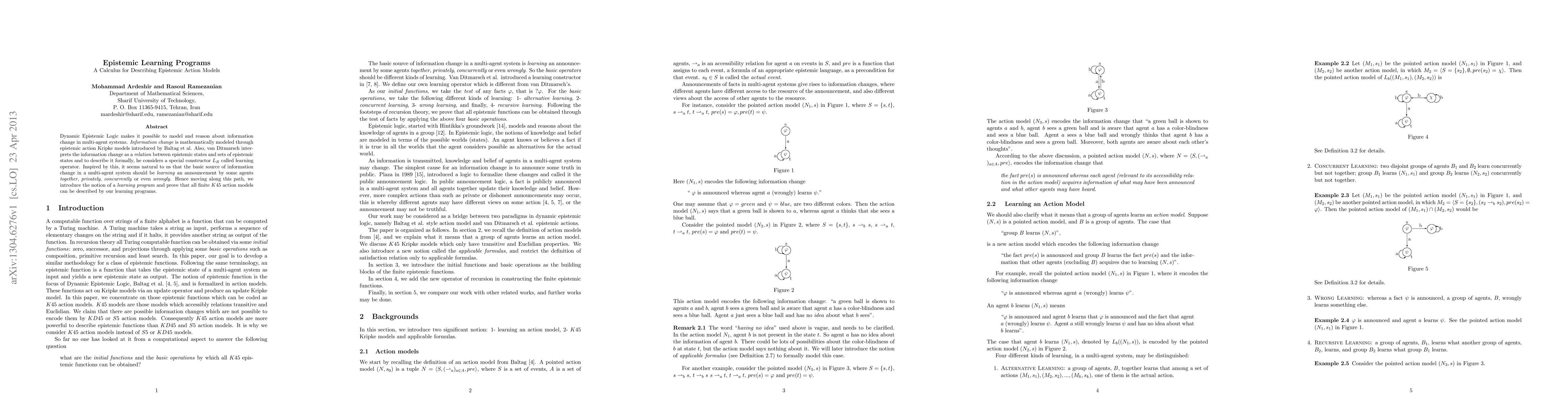 Dynamic Epistemic Logic makes it possible to model and reason about information change in multi-agent systems. Information change is mathematically modeled through epistemic action Kripke models introduced by Baltag et al. Also, van Ditmarsch interprets the information change as a relation between epistemic states and sets of epistemic states and to describe it formally, he considers a special constructor LB called learning operator. Inspired by this, it seems natural to us that the basic source of information change in a multi-agent system should be learning an announcement by some agents together, privately, concurrently or even wrongly. Hence moving along this path, we introduce the notion of a learning program and prove that all finite K45 action models can be described by our learning programs