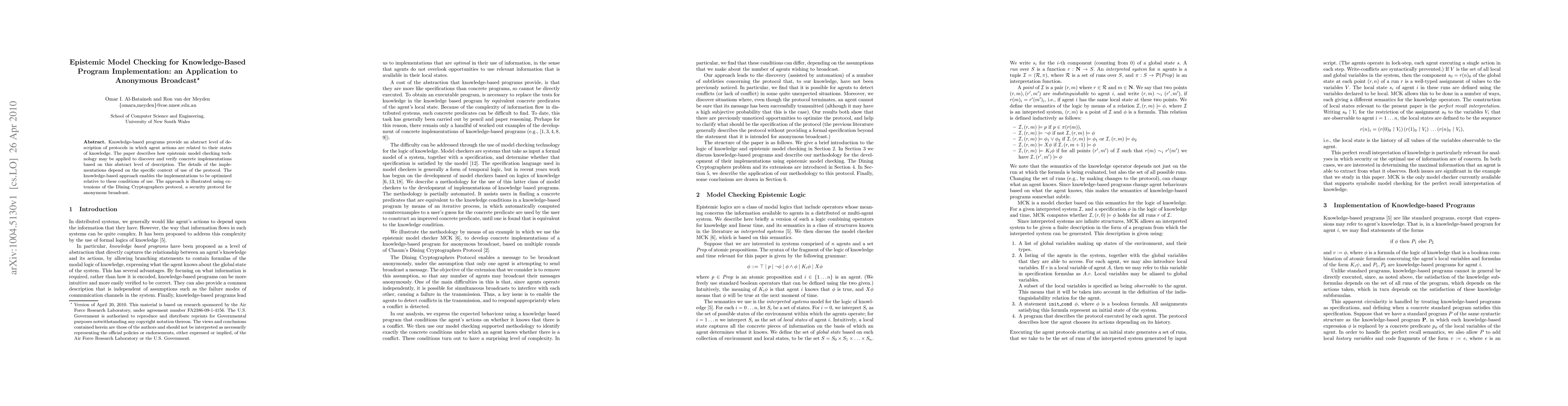 This paper explores the application of epistemic model checking to verify knowledge-based program implementations, optimizing them for specific contexts. It demonstrates the method using an extended version of the Dining Cryptographers protocol for anonymous broadcast.