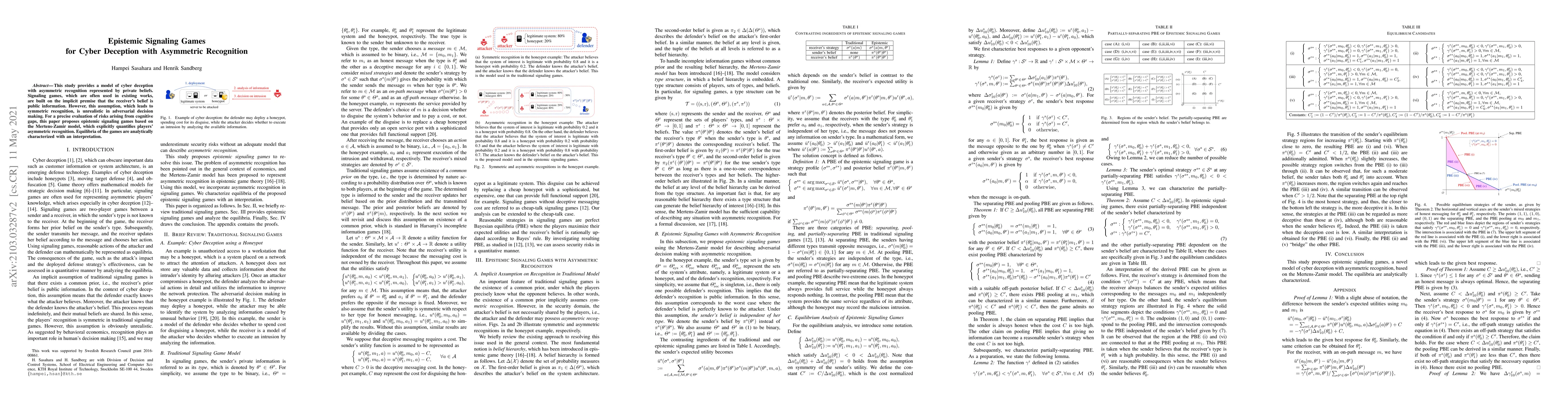 This paper proposes an epistemic signaling game model for cyber deception where recognition is asymmetric due to private beliefs. It analytically characterizes equilibria to evaluate risks from cognitive gaps, contrasting with traditional symmetric recognition models.