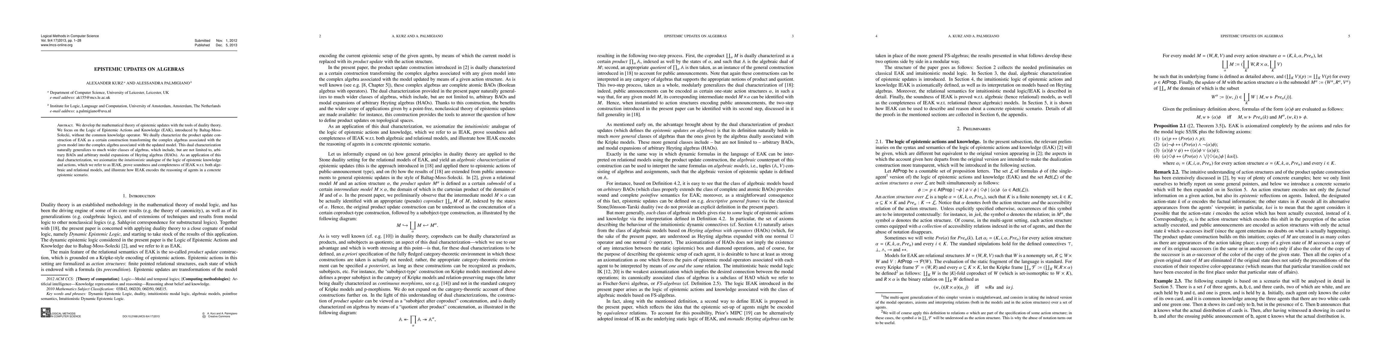 This paper develops a mathematical theory for epistemic updates using duality theory, focusing on the Logic of Epistemic Actions and Knowledge (EAK). It generalizes the product update construction to various algebra classes, axiomatizes an intuitionistic variant (IEAK), and proves its soundness and completeness for both algebraic and relational models.