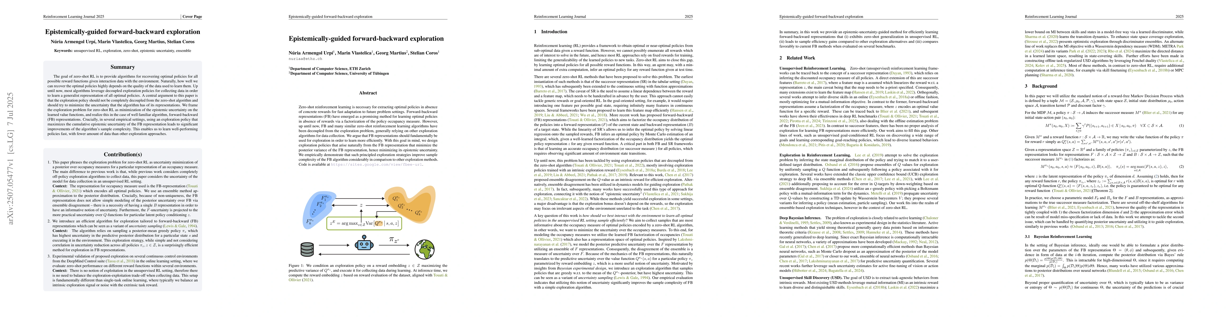 Zero-shot reinforcement learning is necessary for extracting optimal policies in absence of concrete rewards for fast adaptation to future problem settings. Forward-backward representations (FB) have emerged as a promising method for learning optimal policies in absence of rewards via a factorization of the policy occupancy measure. However, up until now, FB and many similar zero-shot reinforcement learning algorithms have been decoupled from the exploration problem, generally relying on other exploration algorithms for data collection. We argue that FB representations should fundamentally be used for exploration in order to learn more efficiently. With this goal in mind, we design exploration policies that arise naturally from the FB representation that minimize the posterior variance of the FB representation, hence minimizing its epistemic uncertainty. We empirically demonstrate that such principled exploration strategies improve sample complexity of the FB algorithm considerably in comparison to other exploration methods. Code is publicly available at https://sites.google.com/view/fbee-url.