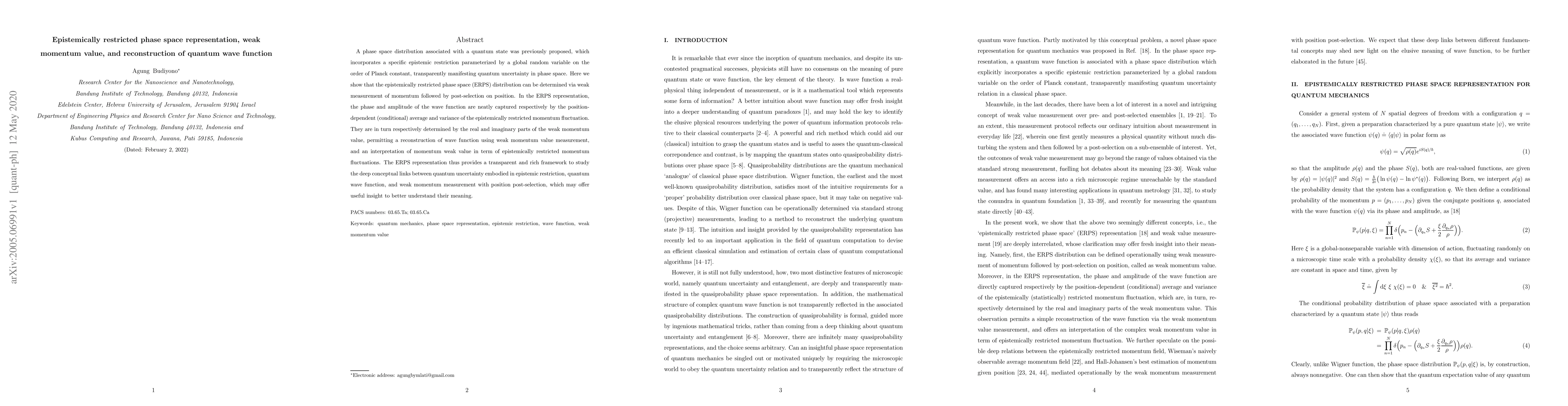 This paper proposes an epistemically restricted phase space (ERPS) distribution to represent quantum states, showing it can be determined through weak momentum measurements followed by position post-selection. The ERPS framework allows for the reconstruction of the quantum wave function using weak momentum values, offering insights into the relationship between quantum uncertainty, wave function, and weak momentum measurements.