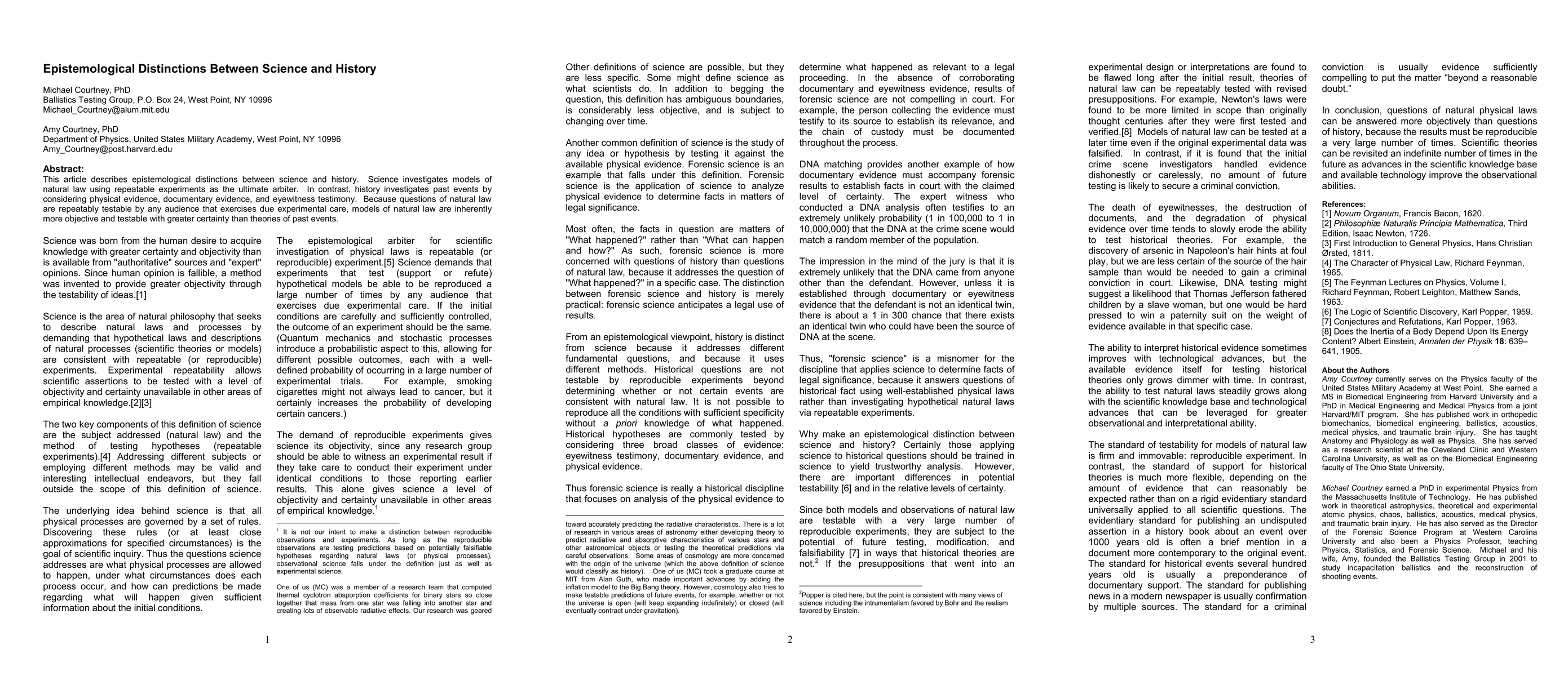 This paper delineates the epistemological differences between science and history, emphasizing that science relies on repeatable experiments to validate natural laws, while history uses physical, documentary, and testimonial evidence to reconstruct past events. Science's objective models are more certain due to their repeatability, unlike history's subjective theories of past events.