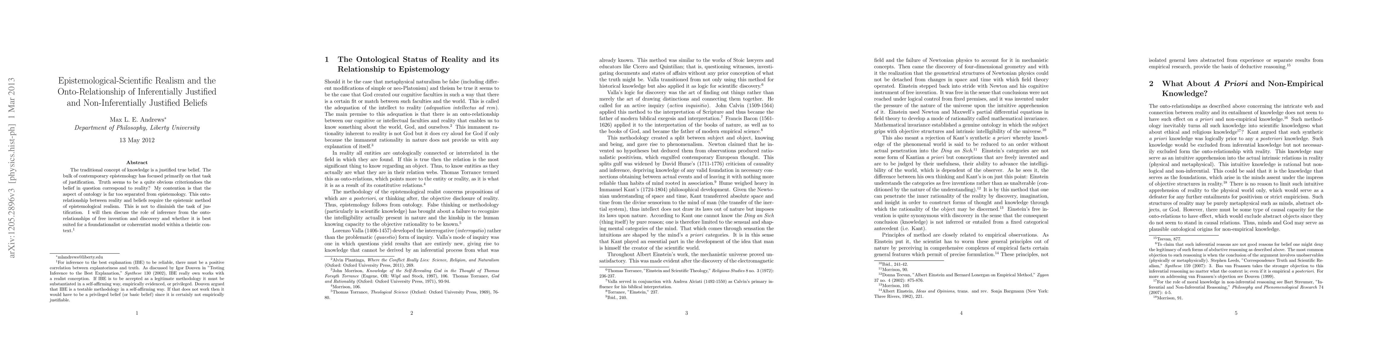 The traditional concept of knowledge is a justified true belief. The bulk of contemporary epistemology has focused primarily on that task of justification. Truth seems to be a quite obvious criterion-does the belief in question correspond to reality? My contention is that the aspect of ontology is far too separated from epistemology. This onto-relationship between reality and beliefs require the epistemic method of epistemological realism. This is not to diminish the task of justification. I will then discuss the role of inference from the onto-relationships of free invention and discovery and whether it is best suited for a foundationalist or coherentist model within a theistic context.