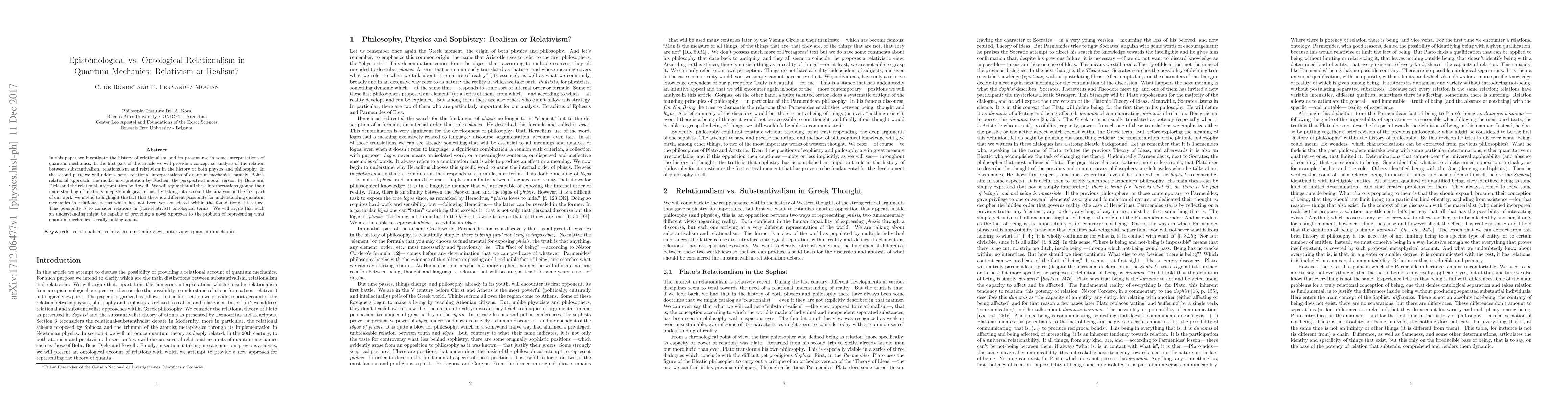In this paper we investigate the history of relationalism and its present use in some interpretations of quantum mechanics. In the first part of this article we will provide a conceptual analysis of the relation between substantivalism, relationalism and relativism in the history of both physics and philosophy. In the second part, we will address some relational interpretations of quantum mechanics, namely, Bohr's relational approach, the modal interpretation by Kochen, the perspectival modal version by Bene and Dieks and the relational interpretation by Rovelli. We will argue that all these interpretations ground their understanding of relations in epistemological terms. By taking into account the analysis on the first part of our work, we intend to highlight the fact that there is a different possibility for understanding quantum mechanics in relational terms which has not been yet considered within the foundational literature. This possibility is to consider relations in (non-relativist) ontological terms. We will argue that such an understanding might be capable of providing a novel approach to the problem of representing what quantum mechanics is really talking about.