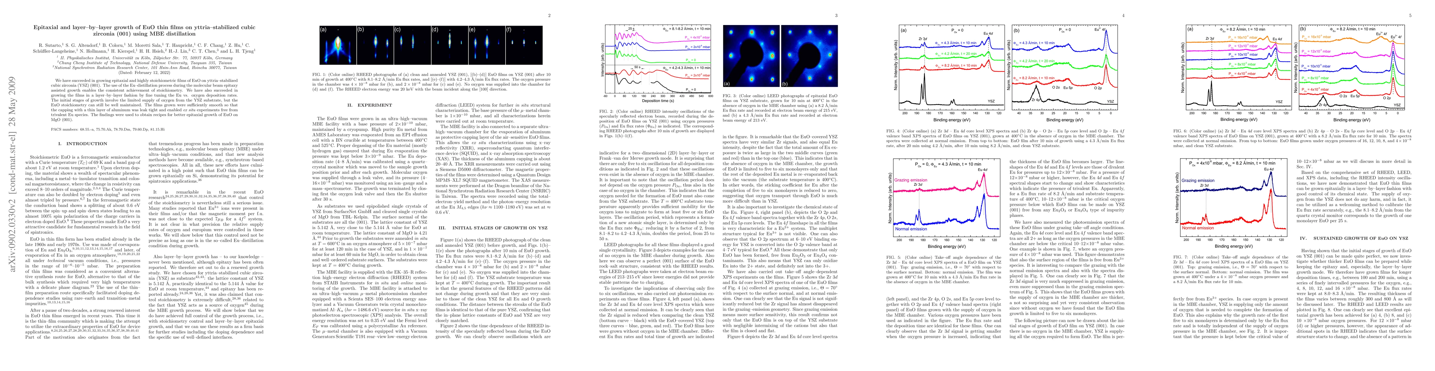 This study details the successful epitaxial growth of EuO thin films on yttria-stabilized cubic zirconia (YSZ) (001) using molecular beam epitaxy (MBE) with Eu-distillation, achieving high stoichiometry and layer-by-layer structure. The films were smooth enough for leak-tight aluminum capping, facilitating ex situ experiments, and provided guidelines for EuO growth on MgO (001).