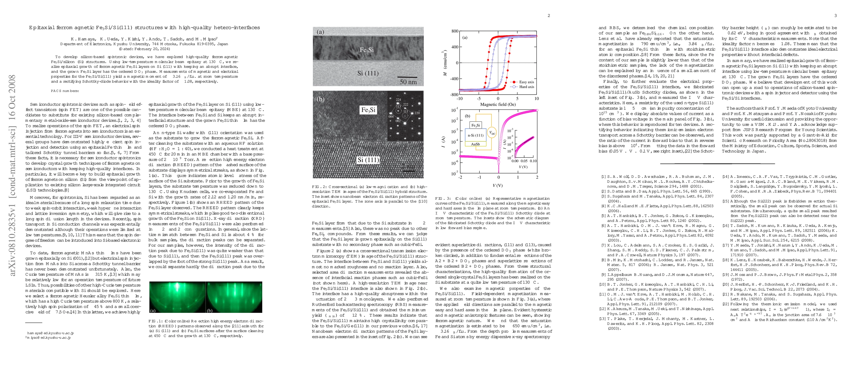 This paper investigates the epitaxial growth of high-quality ferromagnetic Fe$_{3}$Si layers on Si(111) using low-temperature molecular beam epitaxy, achieving the $DO_{3}$ phase. The study reports a magnetic moment of ~3.16 $\mu_{B}$/f.u. at room temperature and rectifying Schottky-diode behavior.