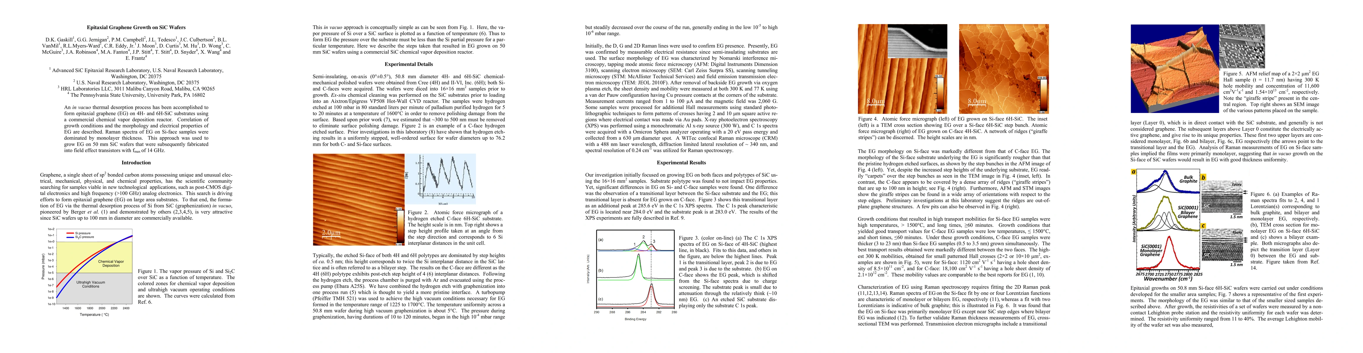 An in vacuo thermal desorption process has been accomplished to form epitaxial graphene (EG) on 4H- and 6H-SiC substrates using a commercial chemical vapor deposition reactor. Correlation of growth conditions and the morphology and electrical properties of EG are described. Raman spectra of EG on Si-face samples were dominated by monolayer thickness. This approach was used to grow EG on 50 mm SiC wafers that were subsequently fabricated into field effect transistors with fmax of 14 GHz.