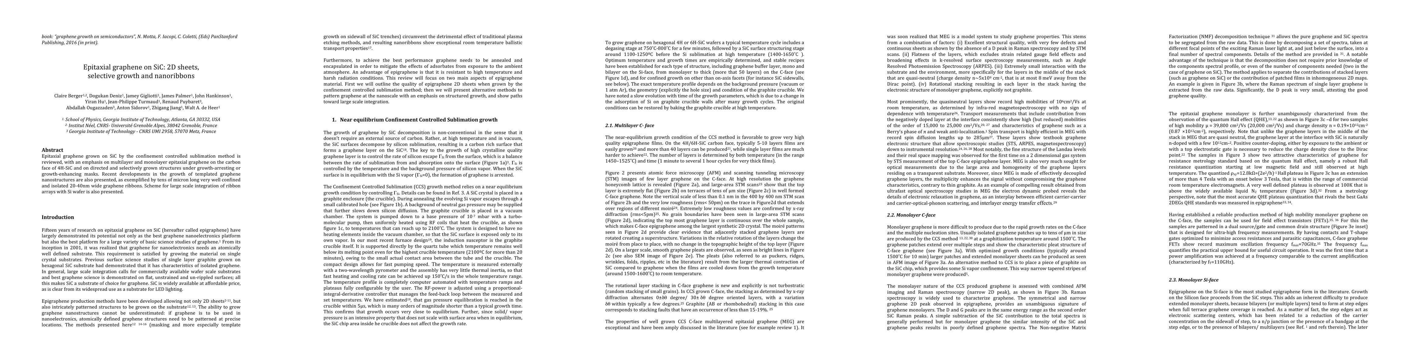 This paper reviews epitaxial graphene growth on SiC using confinement controlled sublimation, focusing on multilayer and monolayer graphene, as well as selective growth techniques to create graphene nanoribbons. It also discusses the integration of these nanoribbons with Si wafers for large-scale applications.