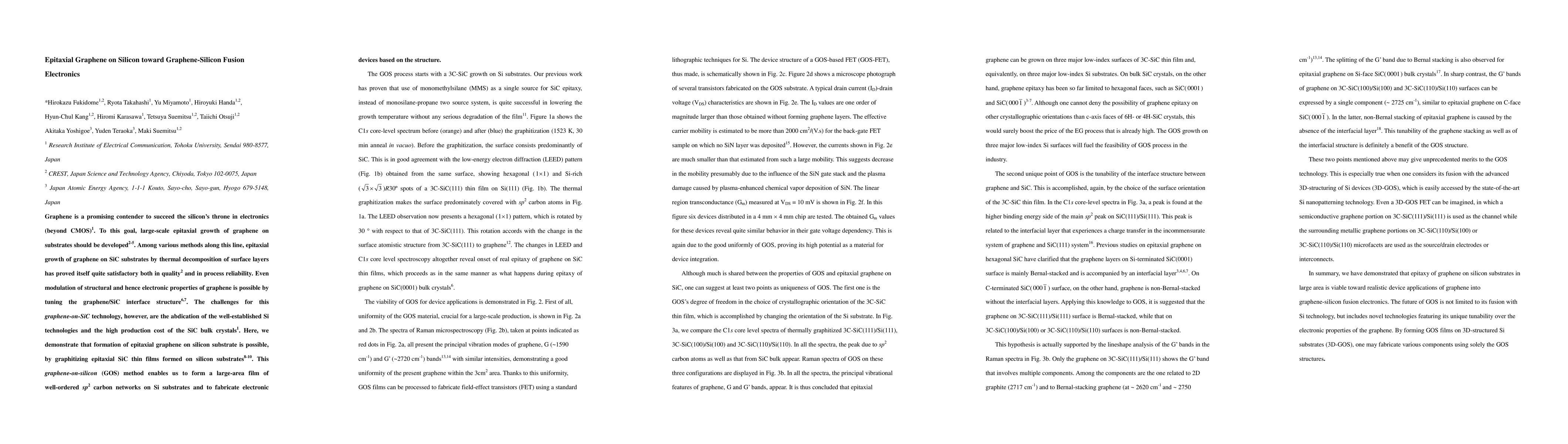 This research demonstrates the epitaxial growth of graphene on silicon substrates via graphitization of epitaxial SiC thin films, achieving large-area, high-quality graphene-on-silicon films for potential fusion electronics applications. The method offers an alternative to expensive SiC substrates while maintaining graphene's desirable electronic properties.
