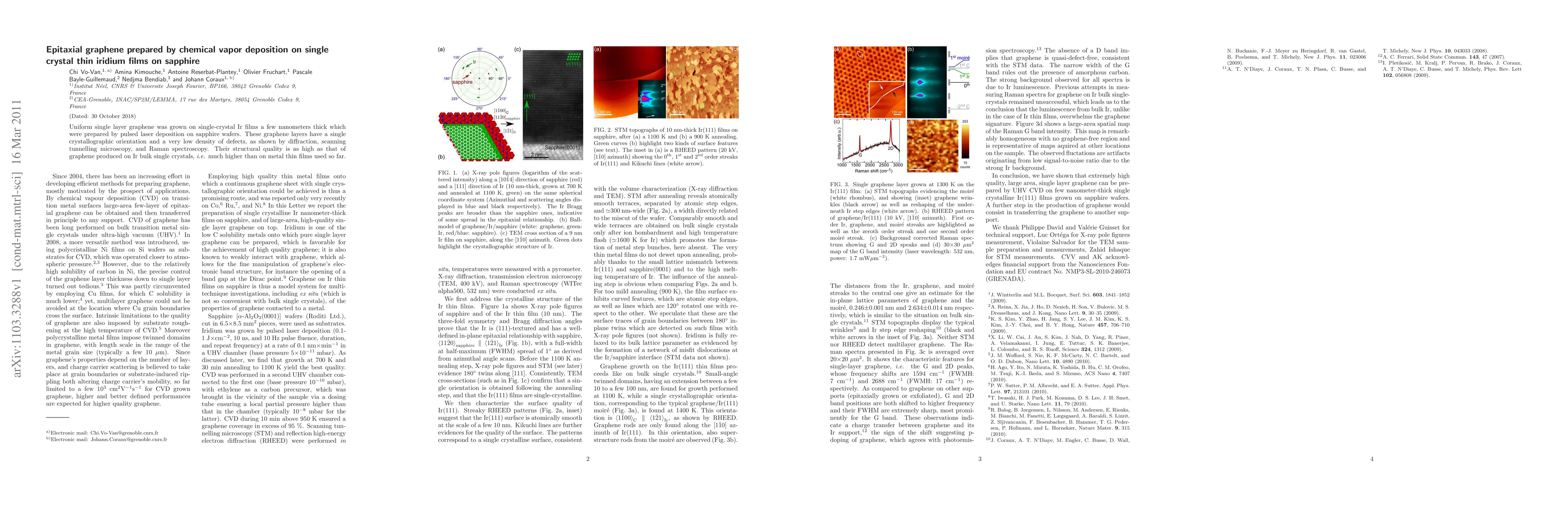 This paper reports the successful growth of uniform single-layer graphene on thin single-crystal iridium films via chemical vapor deposition, achieving a single crystallographic orientation and low defect density, comparable to graphene on bulk Ir crystals. The high structural quality is confirmed through diffraction, scanning tunneling microscopy, and Raman spectroscopy.