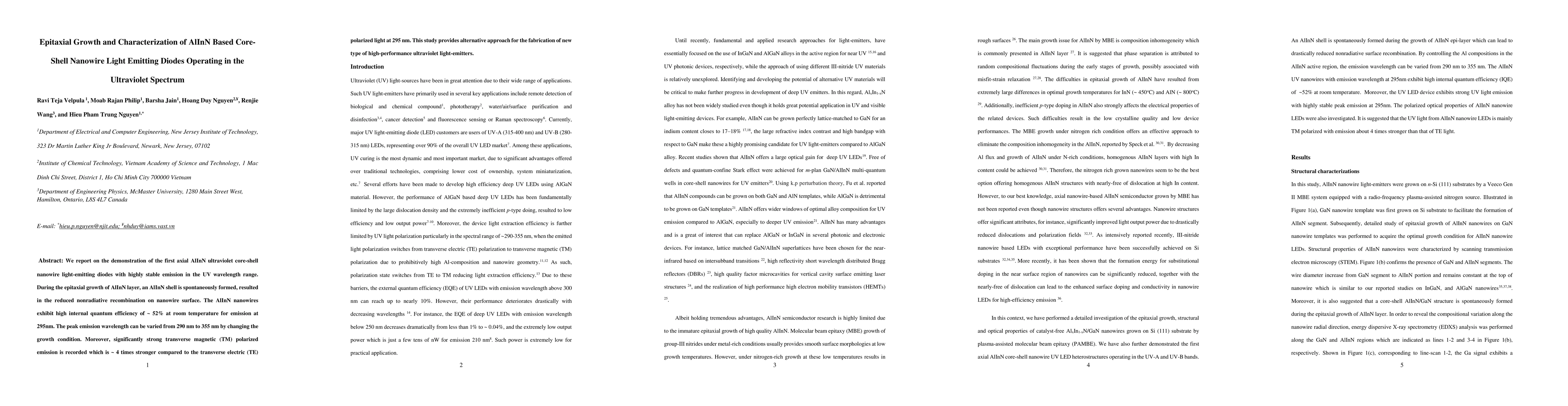 This paper demonstrates the first ultraviolet core-shell nanowire light-emitting diodes based on epitaxially grown AlInN nanowires, achieving stable UV emission and high internal quantum efficiency of ~52% at room temperature. The study also shows tunable emission wavelengths and significantly stronger transverse magnetic polarized emission.