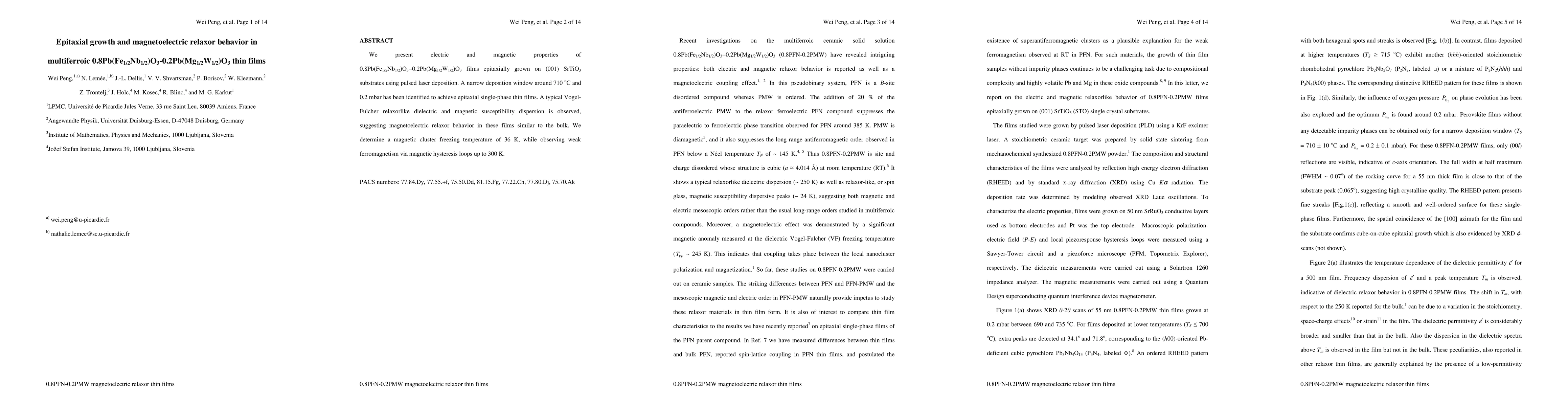 This study reports on the epitaxial growth of 0.8Pb(Fe1/2Nb1/2)O3-0.2Pb(Mg1/2W1/2)O3 thin films on SrTiO3 substrates using pulsed laser deposition, revealing magnetoelectric relaxor behavior with a Vogel-Fulcher dispersion and weak ferromagnetism up to 300 K.