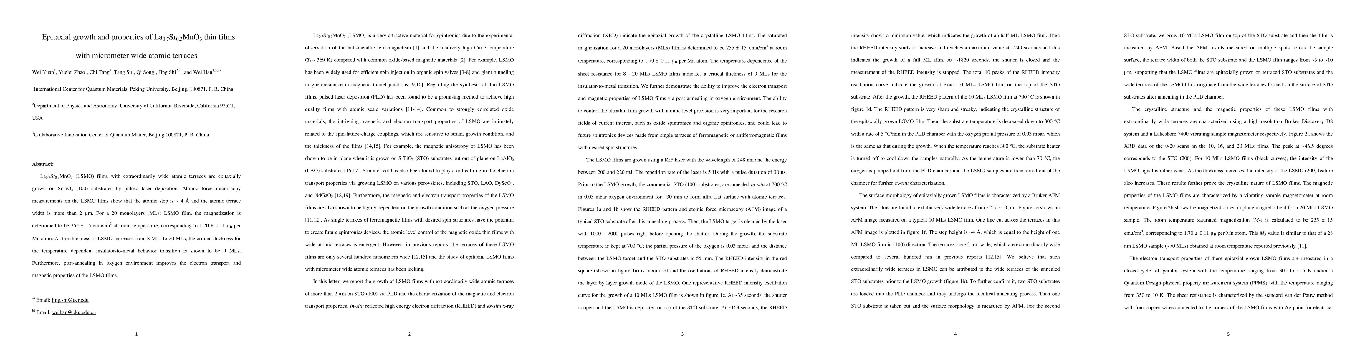 This study details the epitaxial growth of La0.7Sr0.3MnO3 (LSMO) thin films on SrTiO3 substrates, revealing micrometer-wide atomic terraces and enhanced magnetic properties with post-annealing, including a critical thickness of 9 MLs for insulator-to-metal transition.