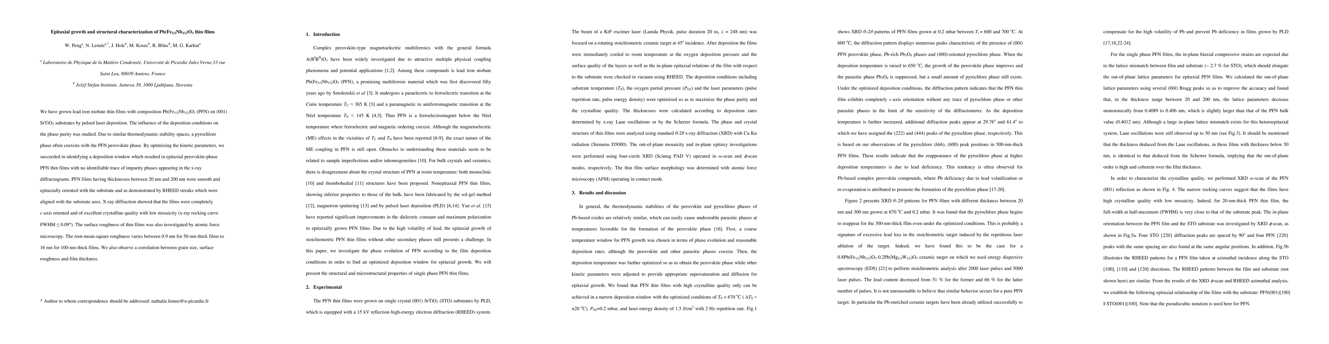 This paper describes the epitaxial growth of Pb(Fe1/2Nb1/2)O3 (PFN) thin films on SrTiO3 substrates using pulsed laser deposition, achieving phase-pure perovskite structures without impurity phases. The films exhibit smooth, epitaxially oriented surfaces with low surface roughness and high crystalline quality.