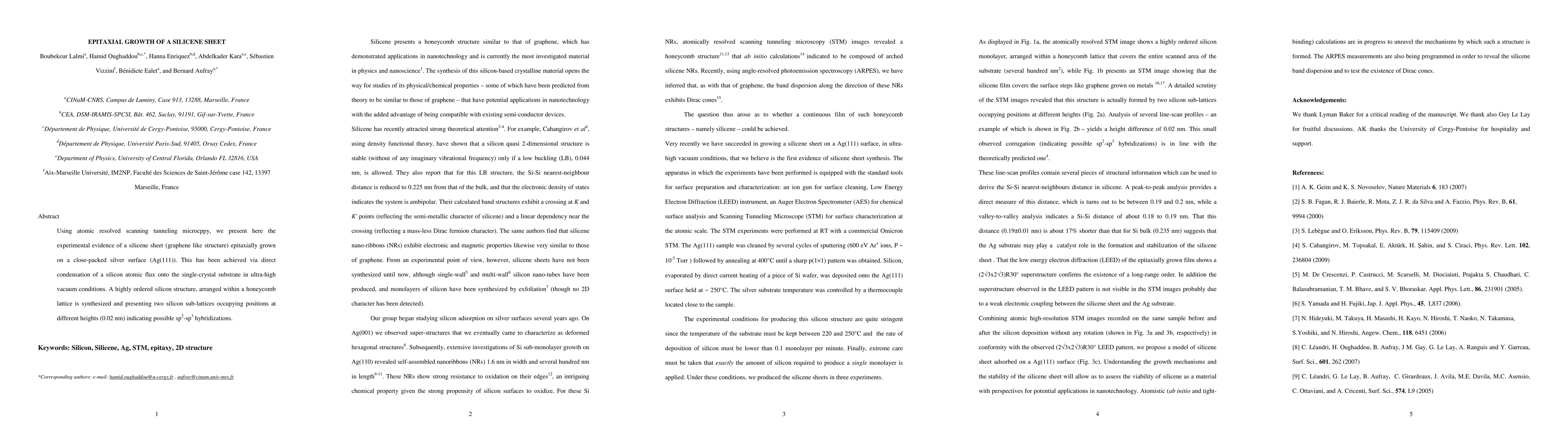 This paper demonstrates the epitaxial growth of a silicene sheet on a silver (Ag(111)) surface using atomic-resolved scanning tunneling microscopy, revealing a honeycomb lattice with two silicon sub-lattices indicating sp2-sp3 hybridizations. The growth was achieved by condensing silicon atoms directly onto the substrate in ultra-high vacuum conditions.