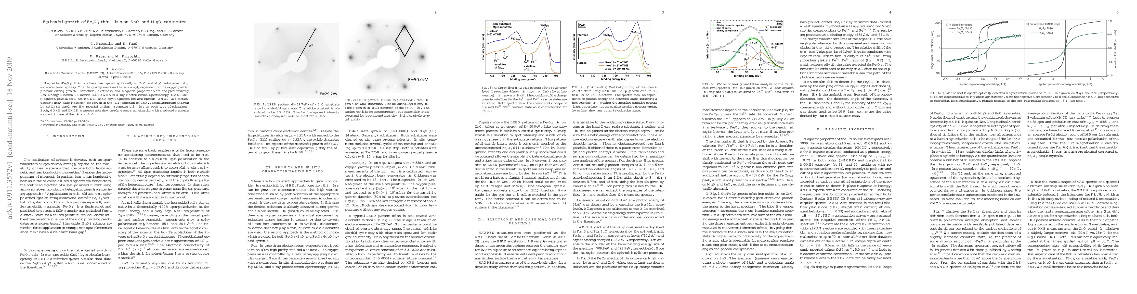 Magnetite thin fims have been grown epitaxially on ZnO and MgO substrates using molecular beam epitaxy. The film quality was found to be strongly dependent on the oxygen partial pressure during growth. Structural, electronic, and magnetic properties were analyzed utilizing Low Energy Electron Diffraction (LEED), HArd X-ray PhotoElectron Spectroscopy (HAXPES), Magneto Optical Kerr Effect (MOKE), and X-ray Magnetic Circular Dichroism (XMCD). Diffraction patterns show clear indication for growth in the (111) direction on ZnO. Vertical structure analysis by HAXPES depth profiling revealed uniform magnetite thin films on both type of substrates. Both, MOKE and XMCD measurements show in-plane easy magnetization with a reduced magnetic moment in case of the films on ZnO.