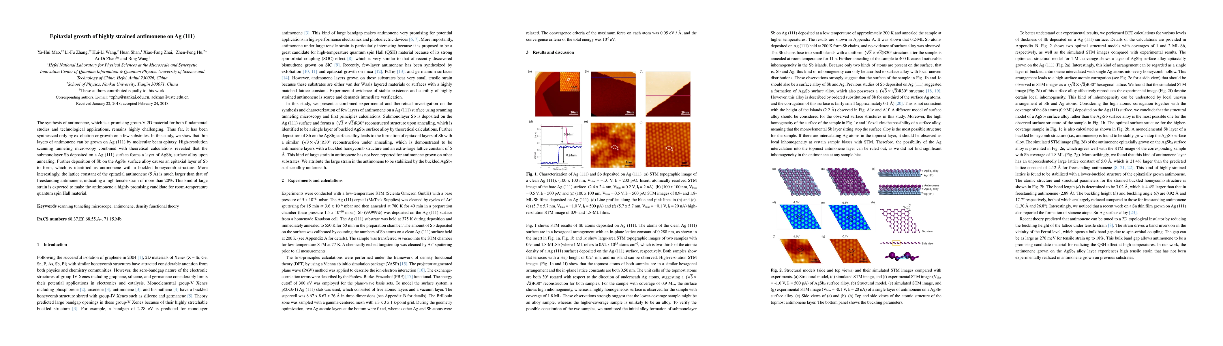 This study demonstrates the epitaxial growth of highly strained antimonene on Ag (111) using molecular beam epitaxy, revealing a lattice constant expansion of over 20%, potentially making it a candidate for quantum spin Hall materials. The method involves forming an AgSb2 surface alloy before depositing additional Sb to grow the strained antimonene layer.