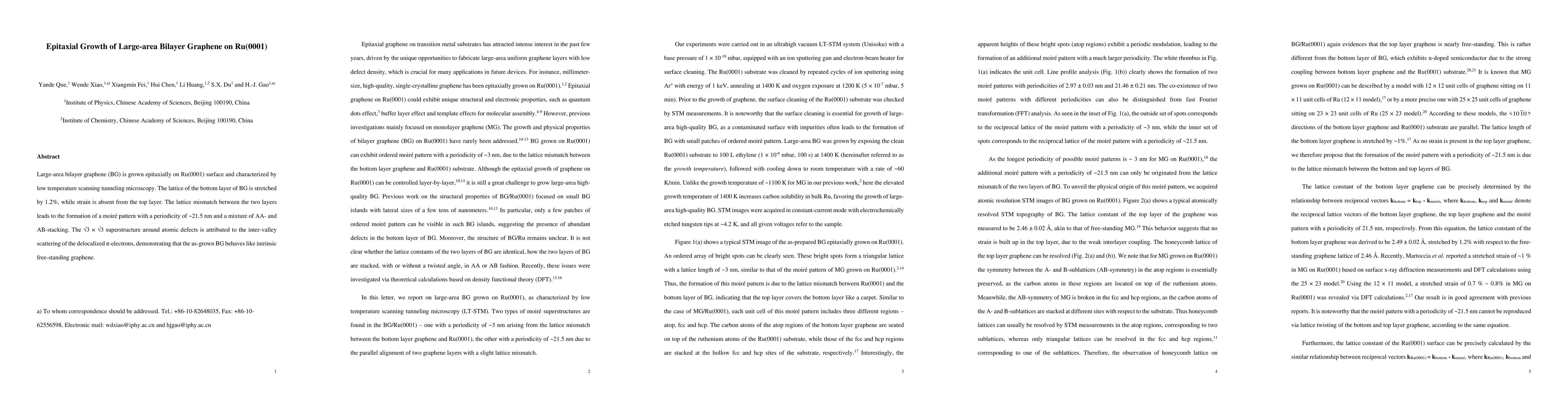 This study reports the epitaxial growth of large-area bilayer graphene on Ru(0001) with a bottom layer experiencing 1.2% lattice stretching, while the top layer remains unstrained. The resulting moire pattern and mixed AA- and AB-stacking reveal intrinsic free-standing graphene behavior due to inter-valley scattering of pi-electrons.