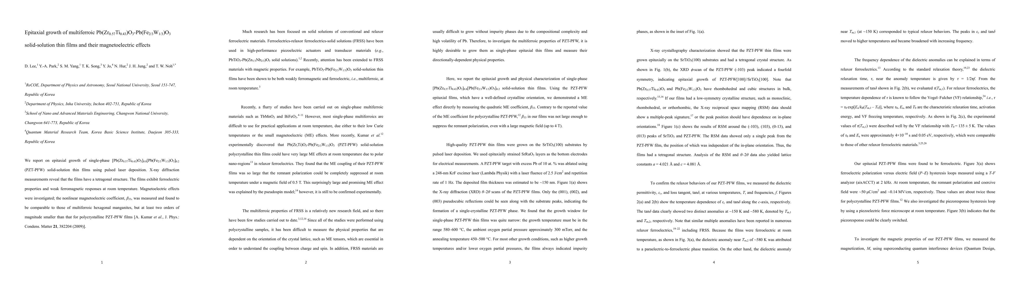 This research details the epitaxial growth of PZT-PFW solid-solution thin films using pulsed laser deposition, revealing a tetragonal structure, ferroelectric and weak ferromagnetic properties, and a magnetoelectric effect comparable to multiferroic manganites but significantly lower than polycrystalline films.