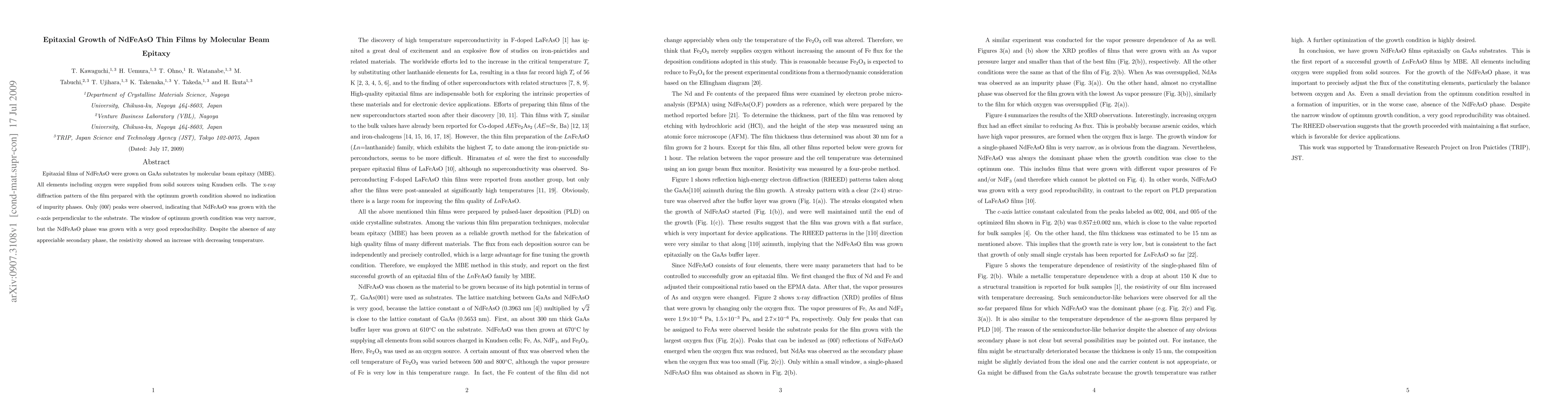 Summary: NdFeAsO thin films were epitaxially grown on GaAs substrates via molecular beam epitaxy, demonstrating a c-axis orientation and high purity, but exhibited unusual resistivity increasing with decreasing temperature despite the absence of impurity phases.