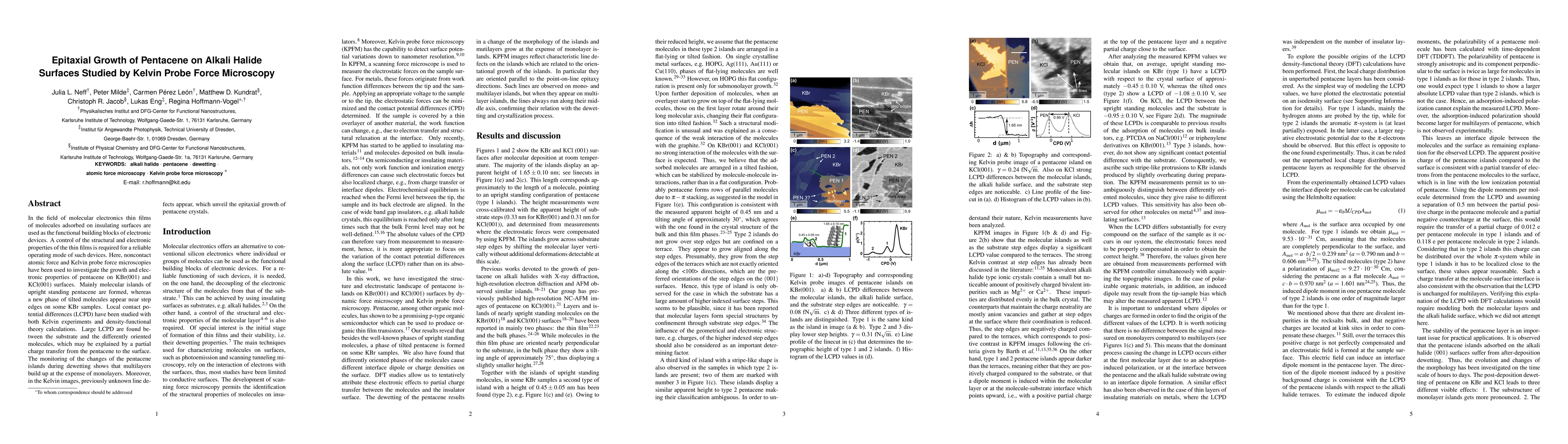 Researchers studied the growth of pentacene on alkali halide surfaces using Kelvin probe force microscopy, finding large contact potential differences between the substrate and molecules, and epitaxial crystal formation.