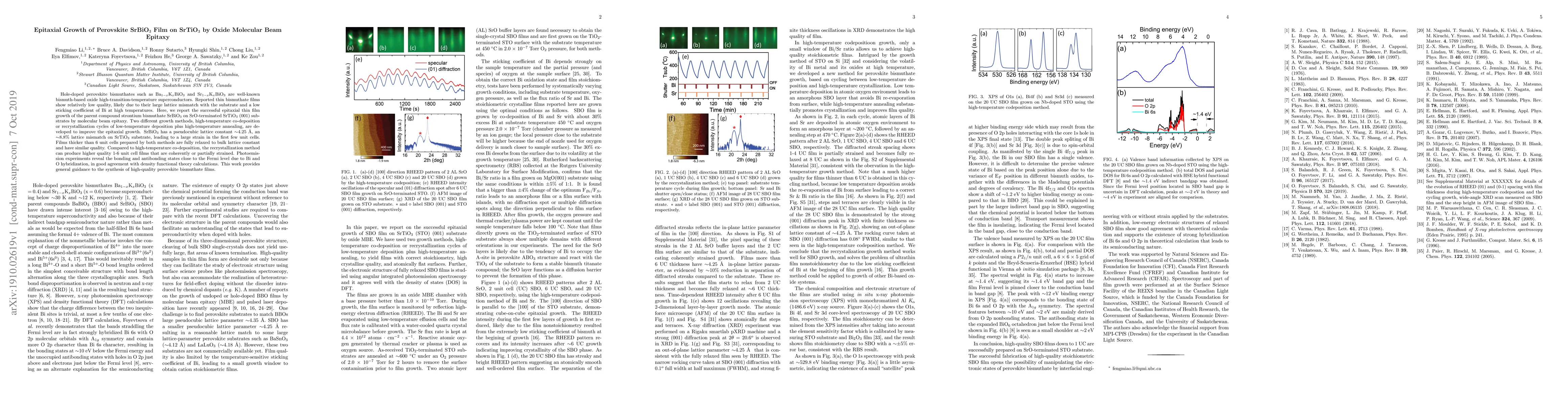 This study reports successful epitaxial growth of SrBiO$_3$ films on SrTiO$_3$ substrates using molecular beam epitaxy, employing high-temperature co-deposition and recrystallization methods. The recrystallization method yields higher quality films, particularly for 1-6 unit cells, while thicker films relax to bulk lattice constants, with bonding and antibonding states confirmed by photoemission and DFT calculations.