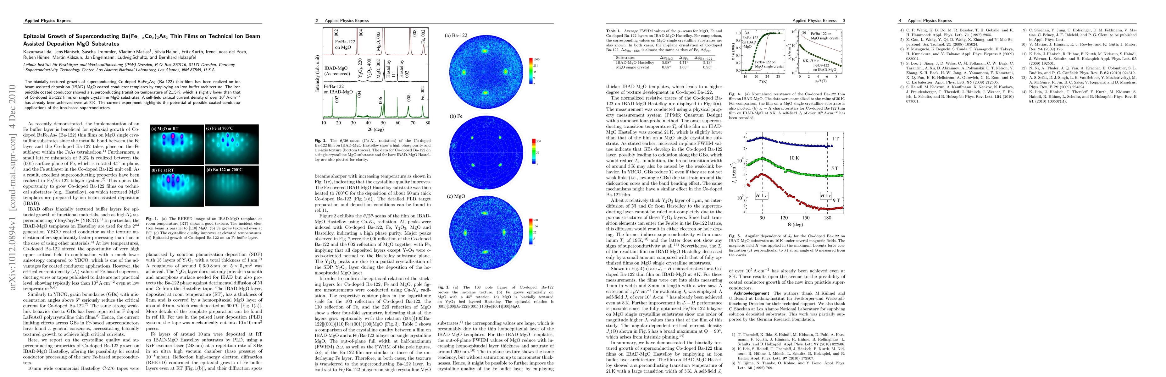 The study details the successful biaxially textured growth of Co-doped BaFe2As2 thin films on IBAD-MgO substrates using an iron buffer, achieving a superconducting transition temperature of 21.5 K and a self-field critical current density of over 10^5 A/cm2 at 8 K, indicating promising coated conductor applications for iron-based superconductors.