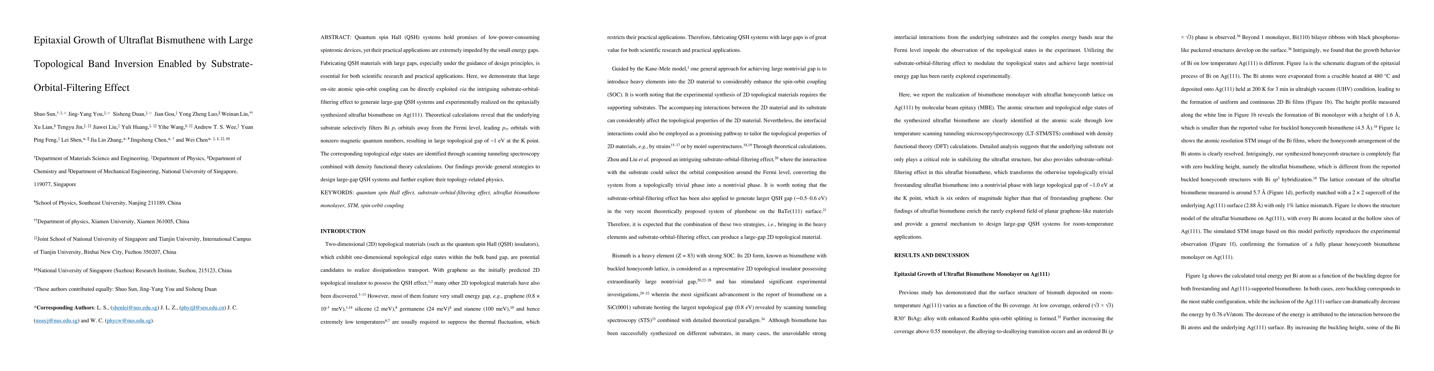 This paper demonstrates the epitaxial growth of ultraflat bismuthene on Ag(111) to create a large-gap quantum spin Hall system, leveraging the substrate-orbital-filtering effect to enhance topological band inversion and achieve a topological gap of ~1 eV. The findings offer a strategy for designing materials with large energy gaps for spintronic applications.