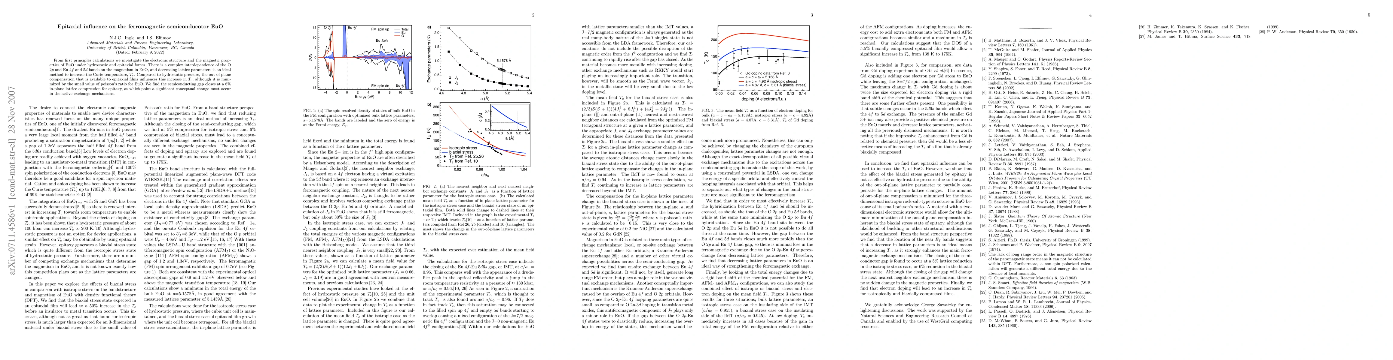 First principles calculations reveal the electronic structure and magnetic properties of EuO under hydrostatic and epitaxial forces, showing that lattice compression increases the Curie temperature. Epitaxy's out-of-plane compensation further enhances this effect but is limited by EuO's low Poisson's ratio, while the semiconducting gap closes at a 6% in-plane lattice compression.