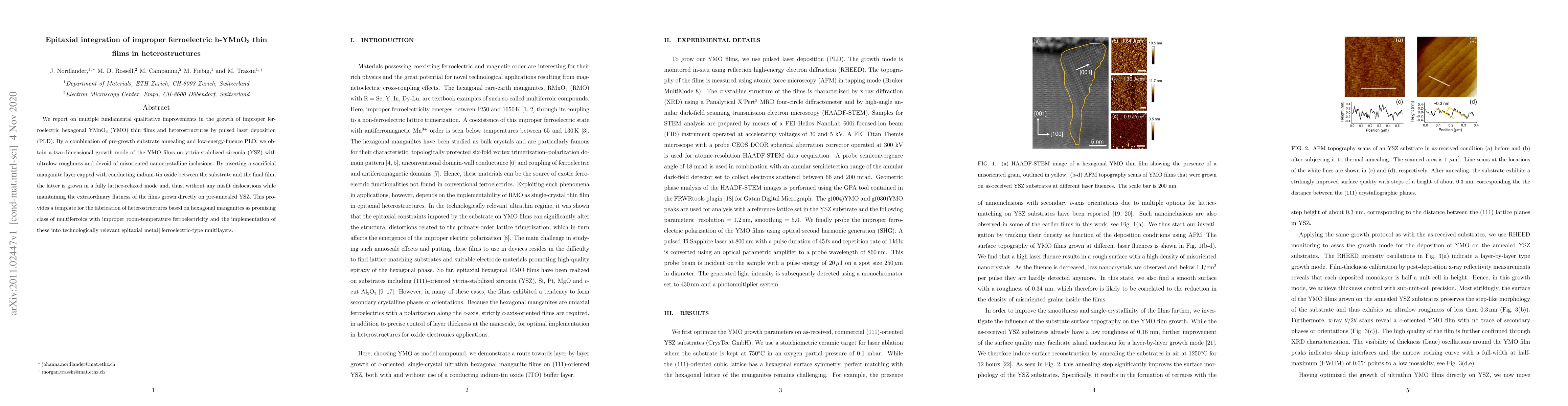This paper details advancements in growing high-quality improper ferroelectric hexagonal YMnO$_3$ (YMO) thin films using pulsed laser deposition, achieving ultralow roughness and lattice-relaxed growth through strategic substrate annealing and sacrificial layer insertion, setting the stage for multiferroic heterostructures.
