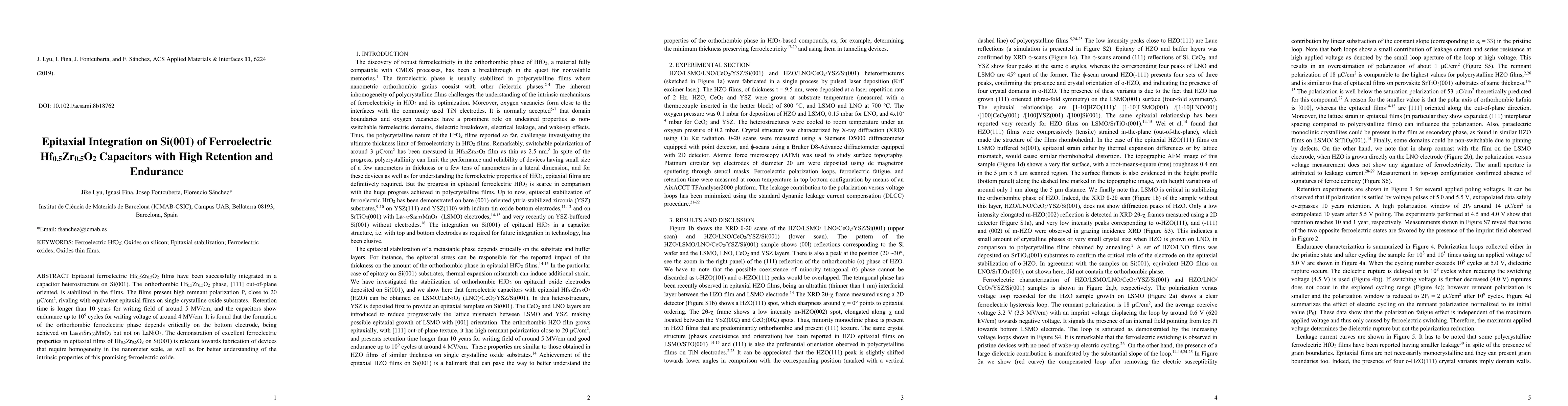 This paper reports the successful epitaxial integration of ferroelectric Hf0.5Zr0.5O2 capacitors on Si(001) with high remnant polarization and long retention time, demonstrating potential for advanced device fabrication. The orthorhombic phase stabilization and high endurance are shown to depend on the choice of bottom electrode.