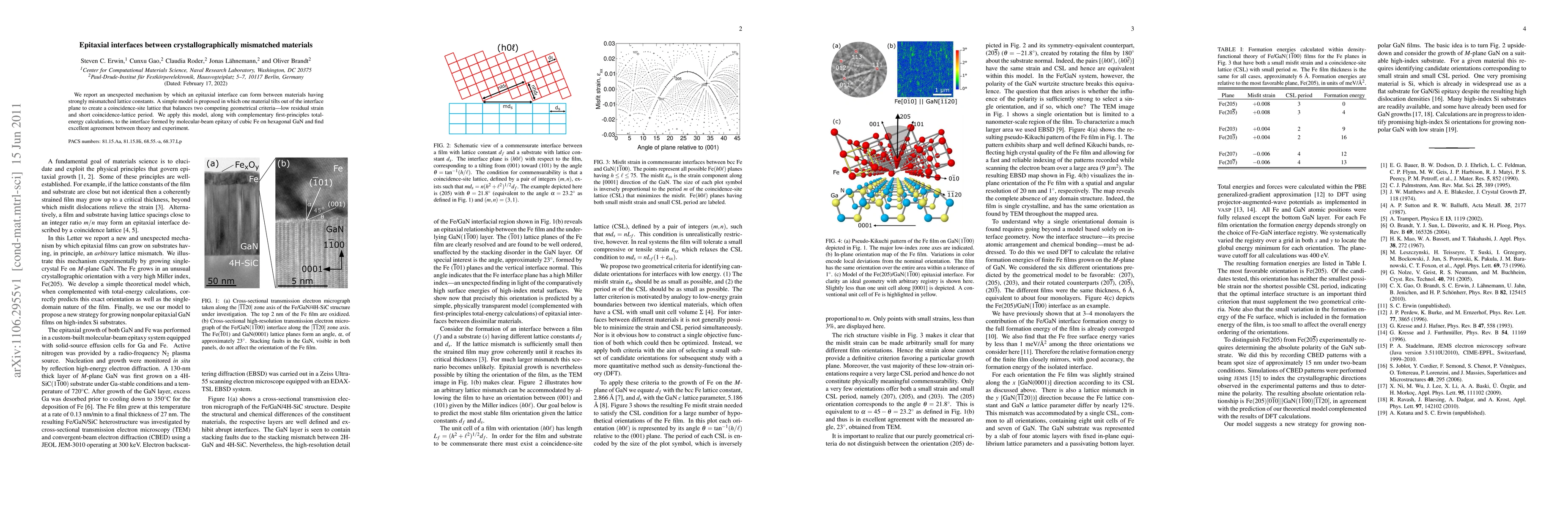 We report an unexpected mechanism by which an epitaxial interface can form between materials having strongly mismatched lattice constants. A simple model is proposed in which one material tilts out of the interface plane to create a coincidence-site lattice that balances two competing geometrical criteria---low residual strain and short coincidence-lattice period. We apply this model, along with complementary first-principles total-energy calculations, to the interface formed by molecular-beam epitaxy of cubic Fe on hexagonal GaN and find excellent agreement between theory and experiment.